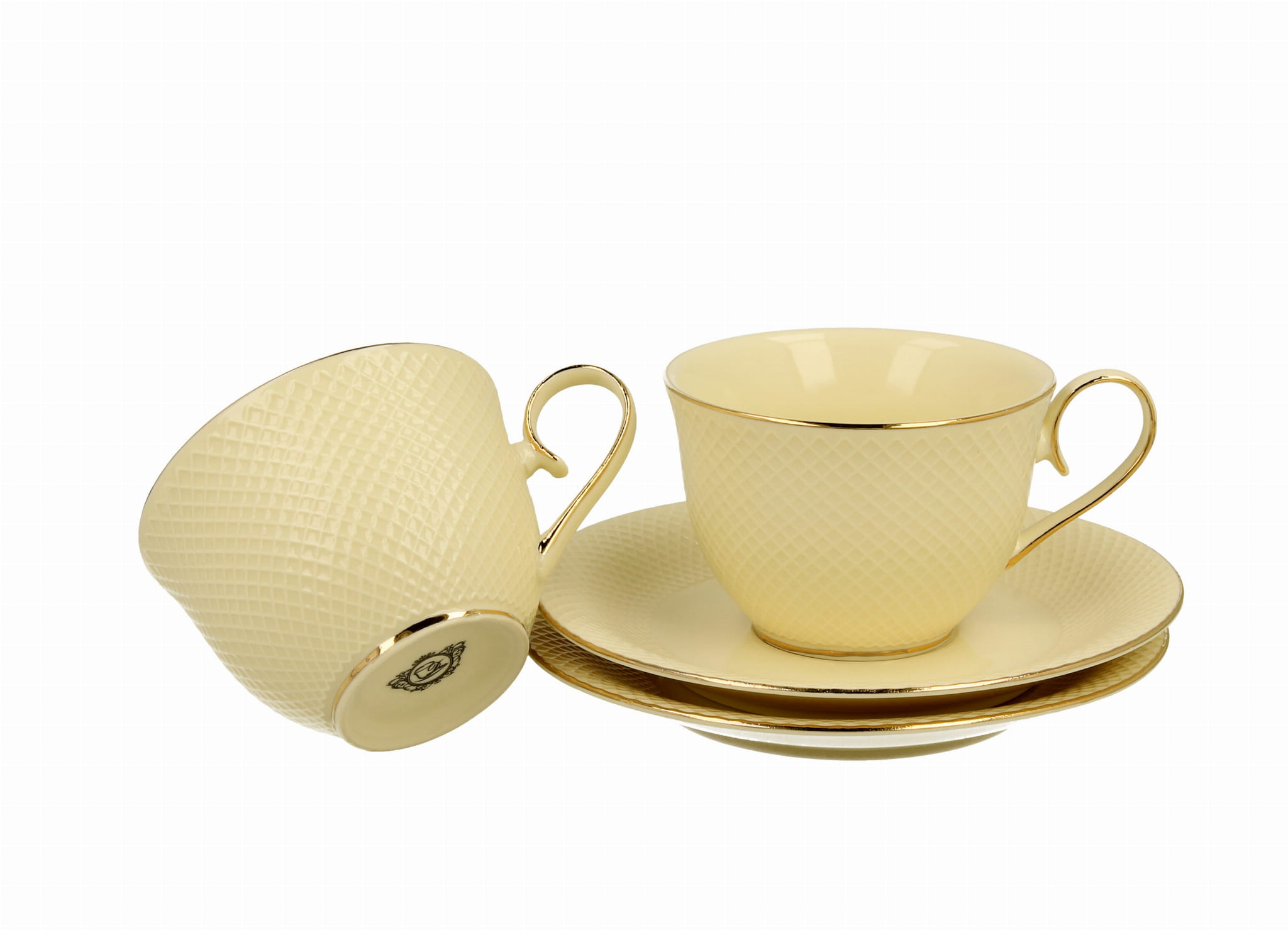 Wykonane z najwyższej jakości porcelany w kolorze śmietankowym, filiżanki zachwycają ponadczasowym designemi wyrafinowanymi zdobieniami. Złote detale i tłoczenia przypominające słodki wafelek nadają im niepowtarzalnego uroku i nutki nostalgii.