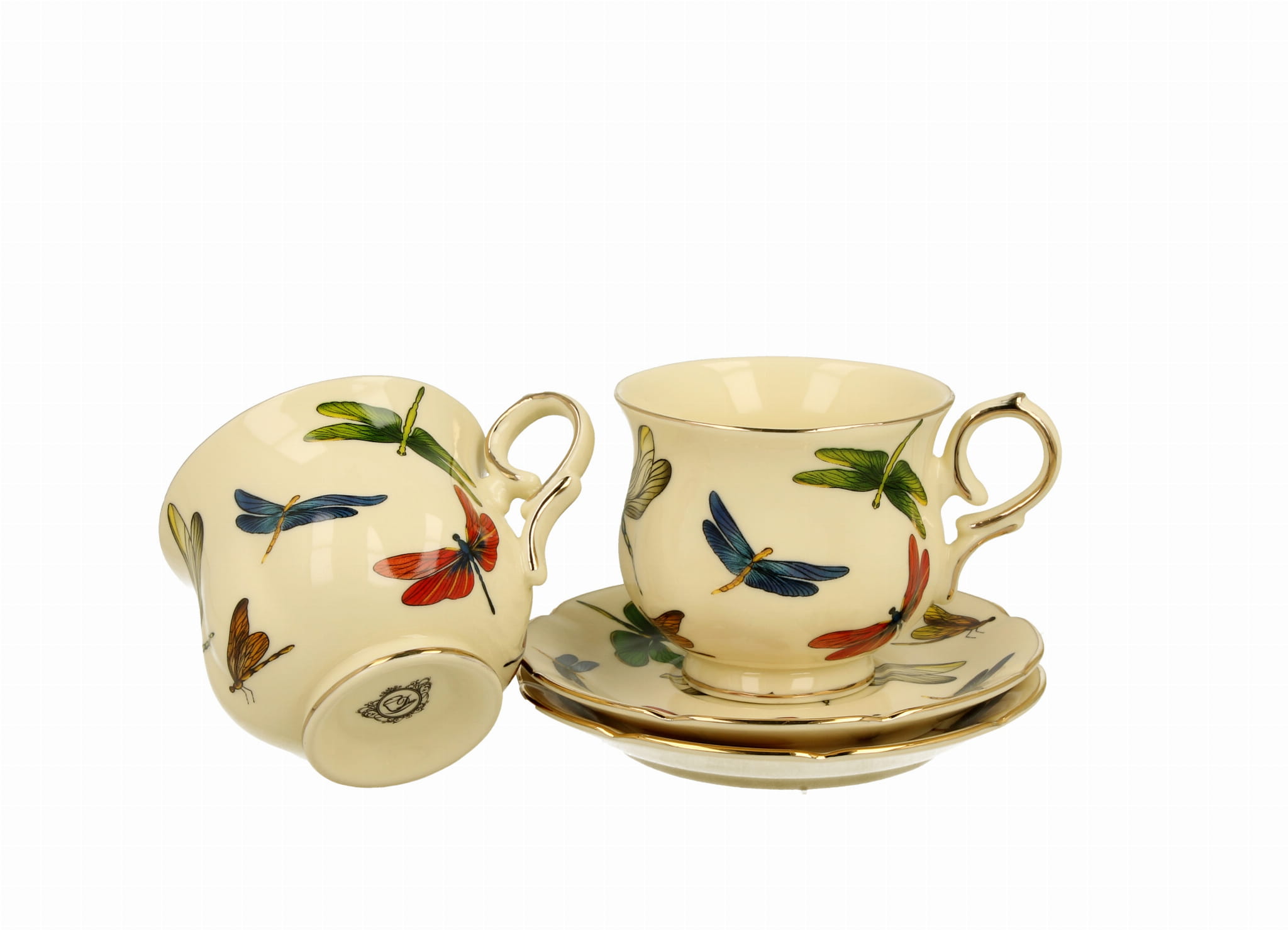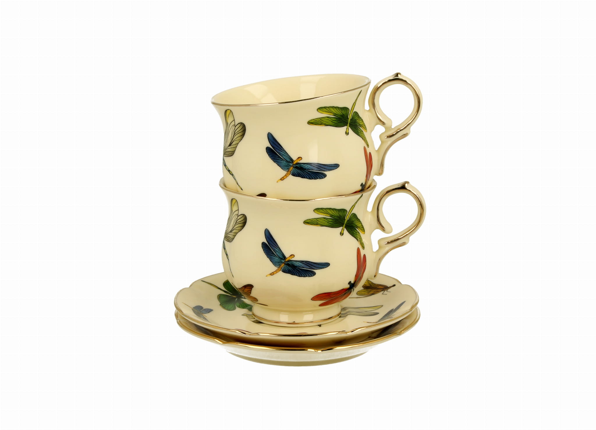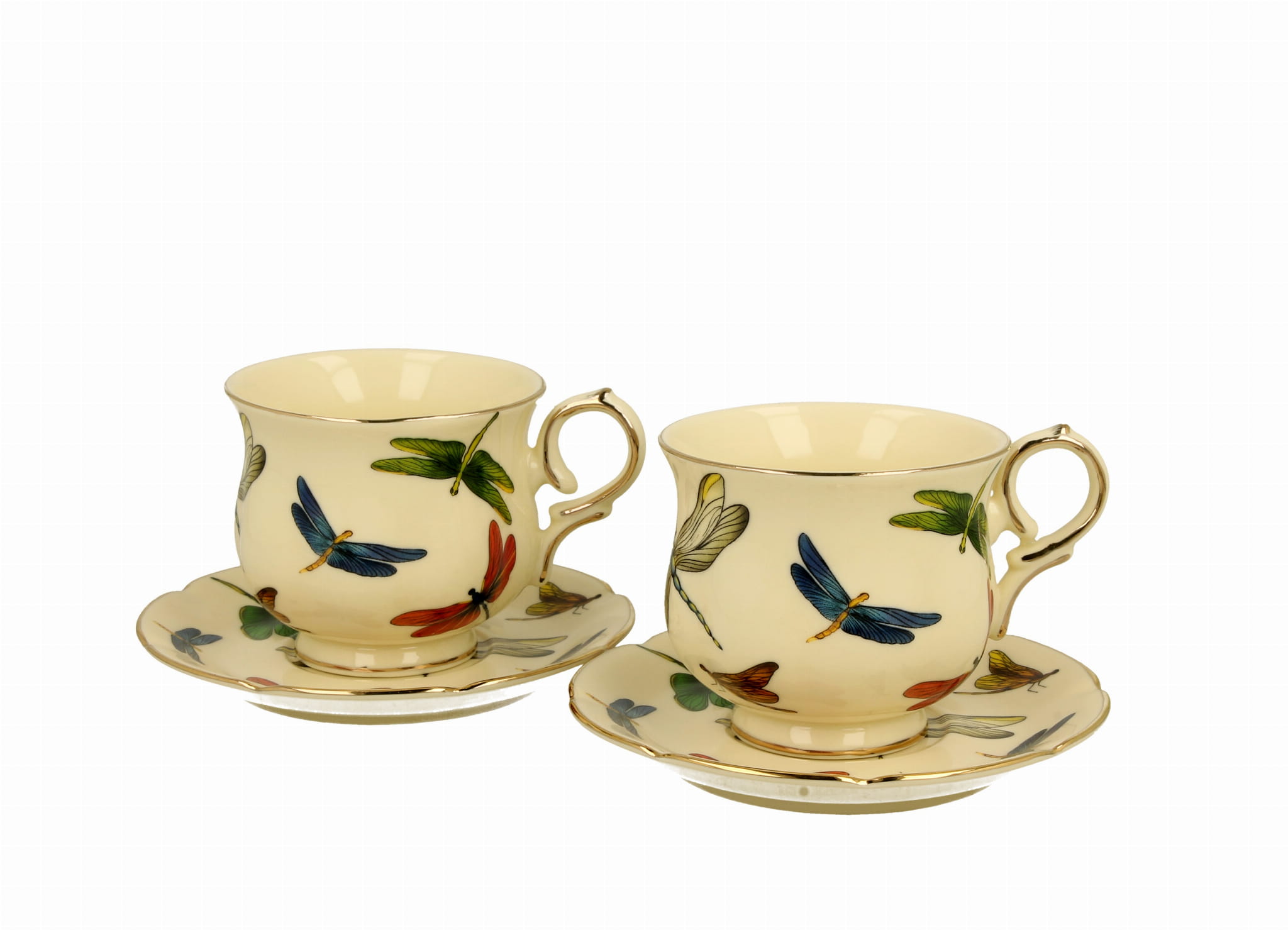 Wykonane z najwyższej jakości porcelany w kolorze ecru, filiżanki zachwycają subtelnym designem i wyrazistymi zdobieniami. Motyw kolorowych, eterycznych ważek w połączeniu ze złotymi detalami nadaje im niepowtarzalnego uroku i wakacyjnego klimatu.