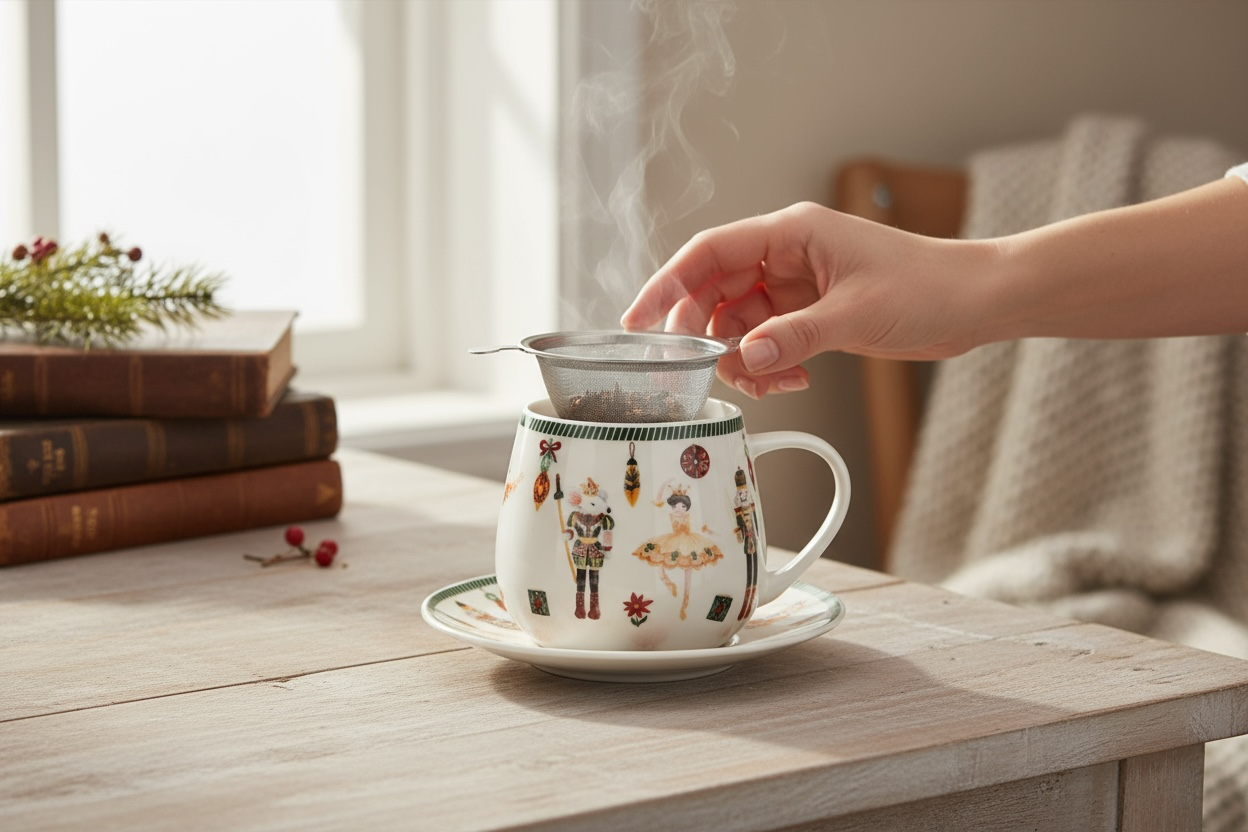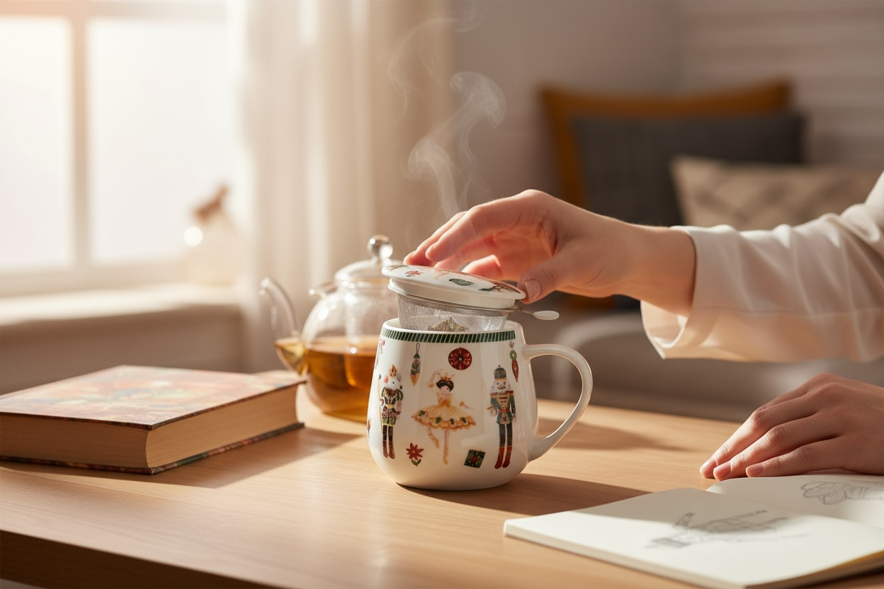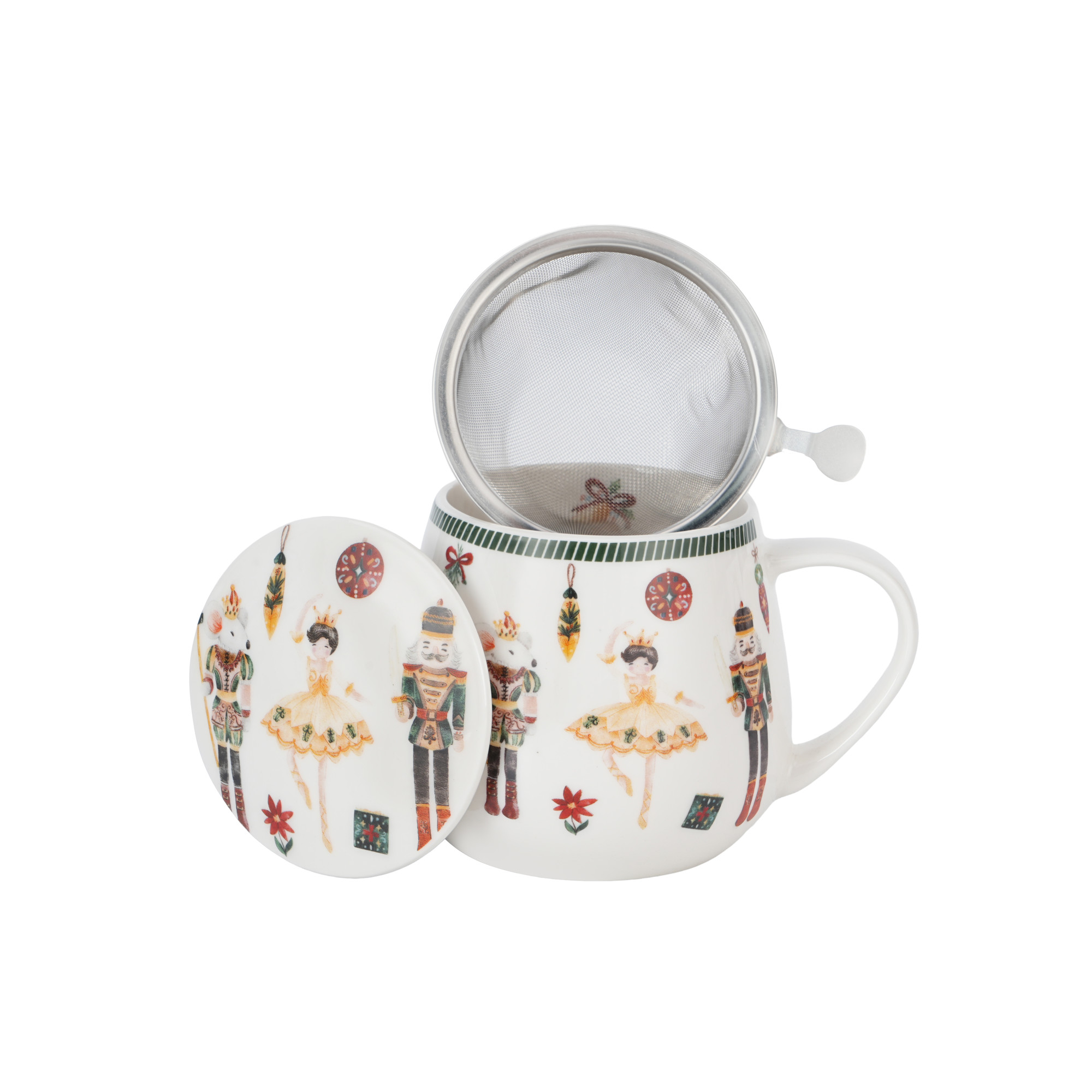 Kubek baryłka z zaparzaczem i pokrywką z serii Świątecznej CHRISTMAS NUTCRACKER wykonany jest z porcelany New Bone China, która charakteryzuje się elegancką, naturalną kremowo-białą barwą z delikatnym połyskiem oraz wyjątkową wytrzymałością. Ten praktyczny kubek idealnie nadaje się do przyrządzania ulubionych ziół i aromatycznej herbaty, łącząc funkcjonalność z świątecznym designem.