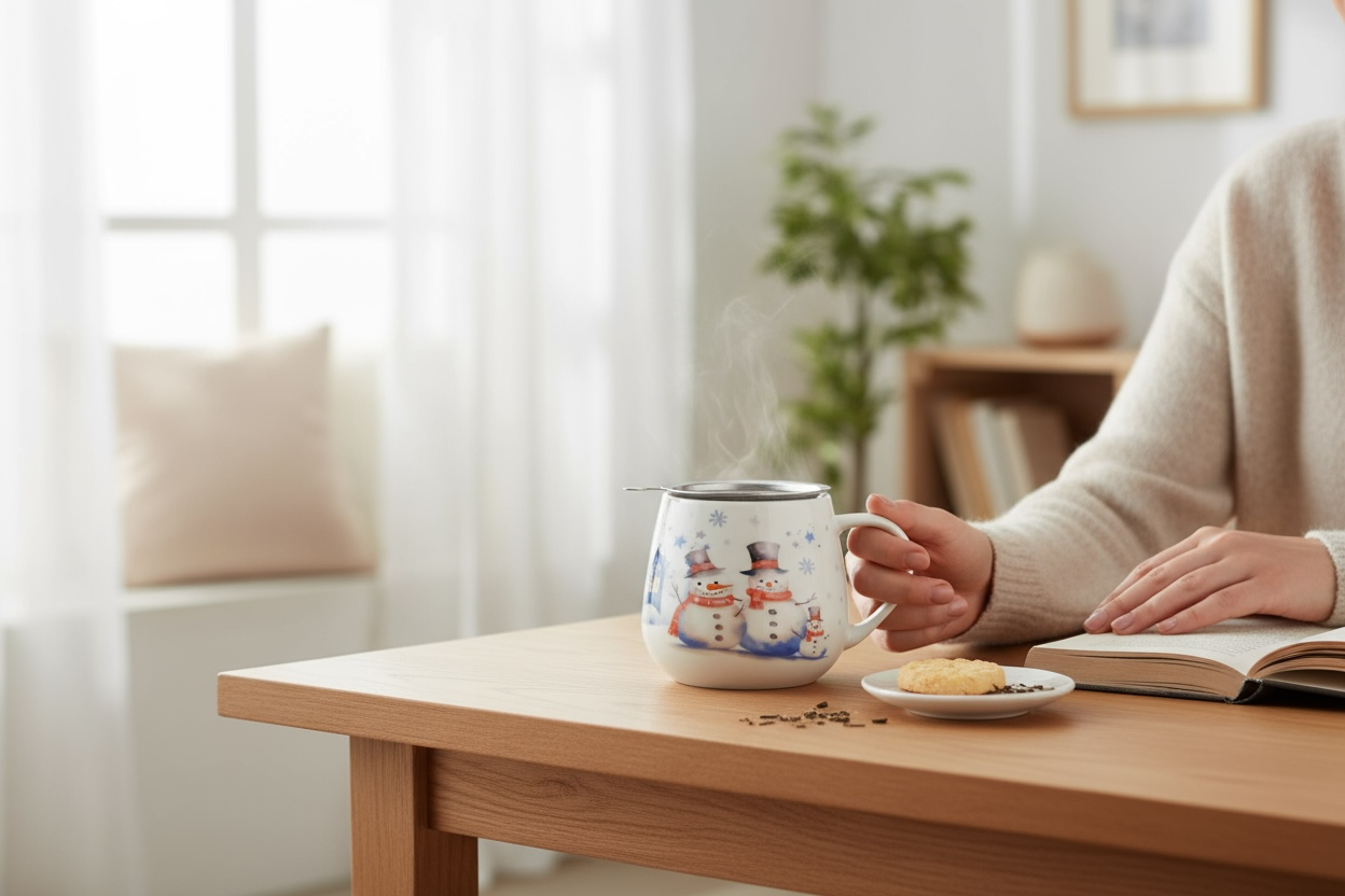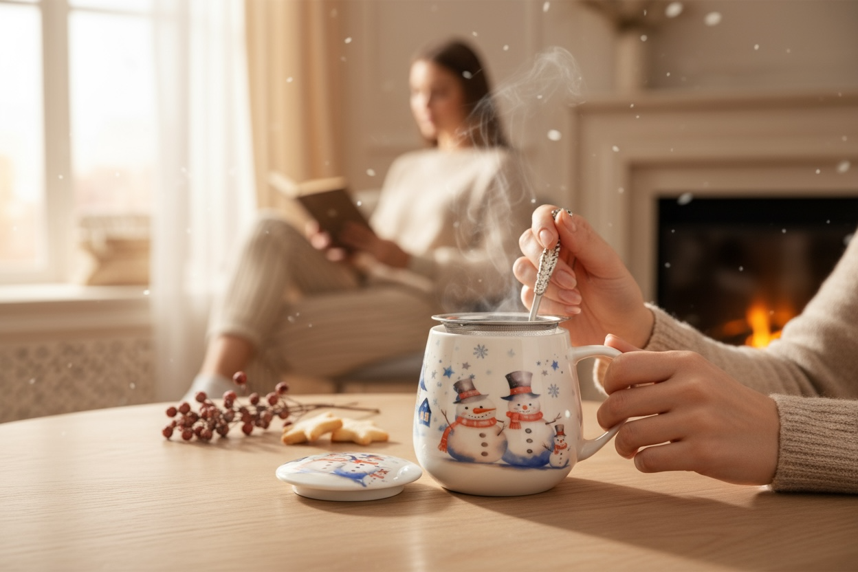 Kubek baryłka z zaparzaczem i pokrywką z serii Świątecznej SNOWMAN wykonany jest z porcelany New Bone China, charakteryzującej się elegancką i naturalną kremowo-białą barwą z delikatnym połyskiem oraz wyjątkową wytrzymałością. To praktyczny i stylowy kubek doskonały do przyrządzania ulubionych ziół i aromatycznej herbaty.