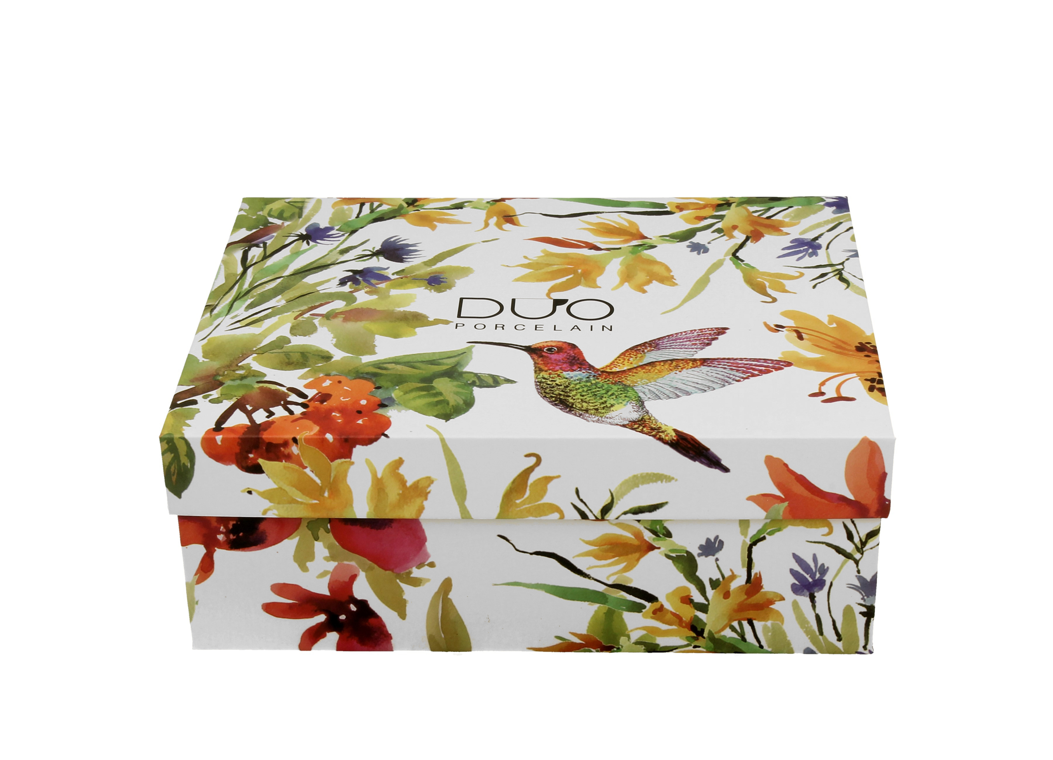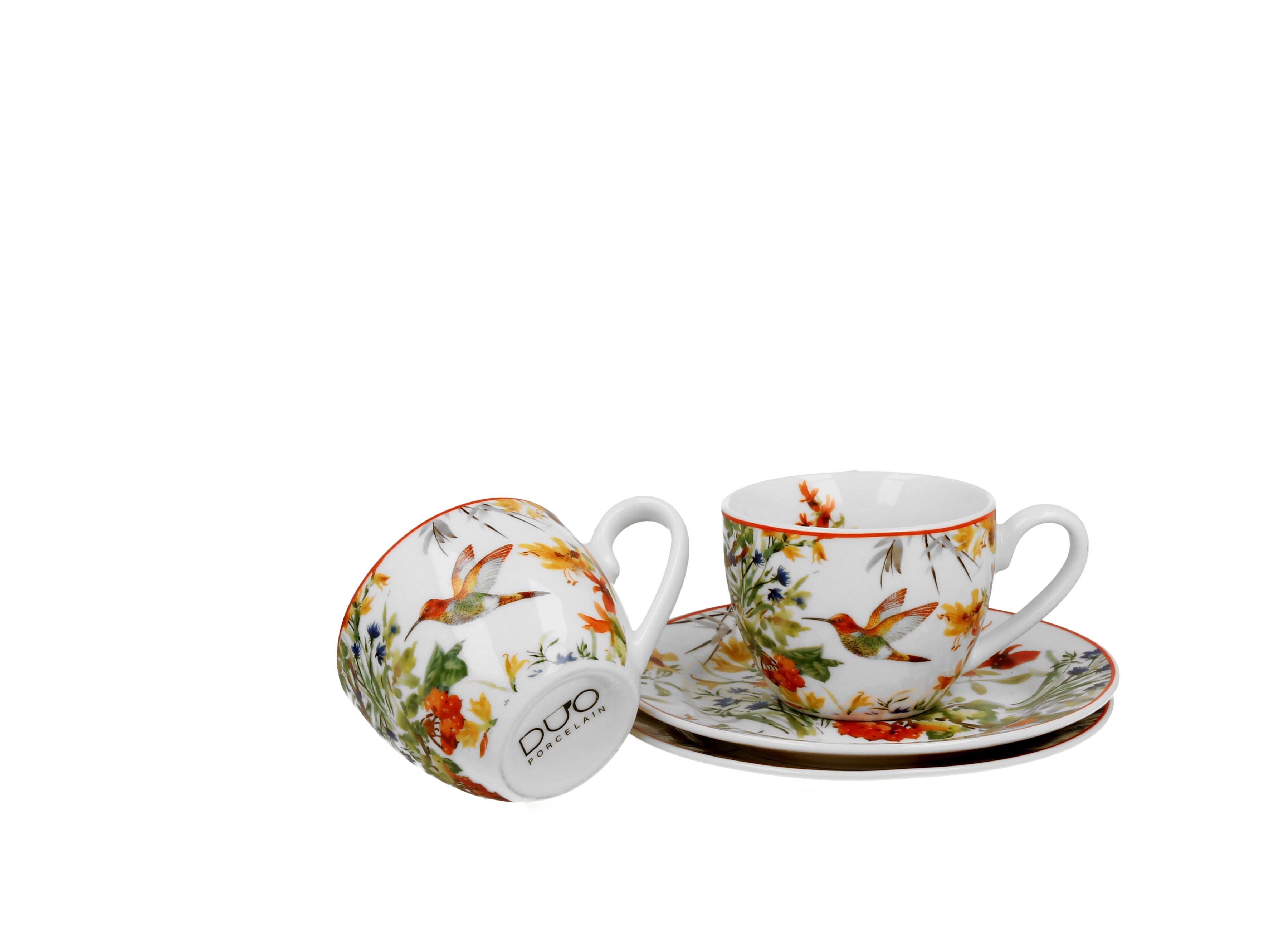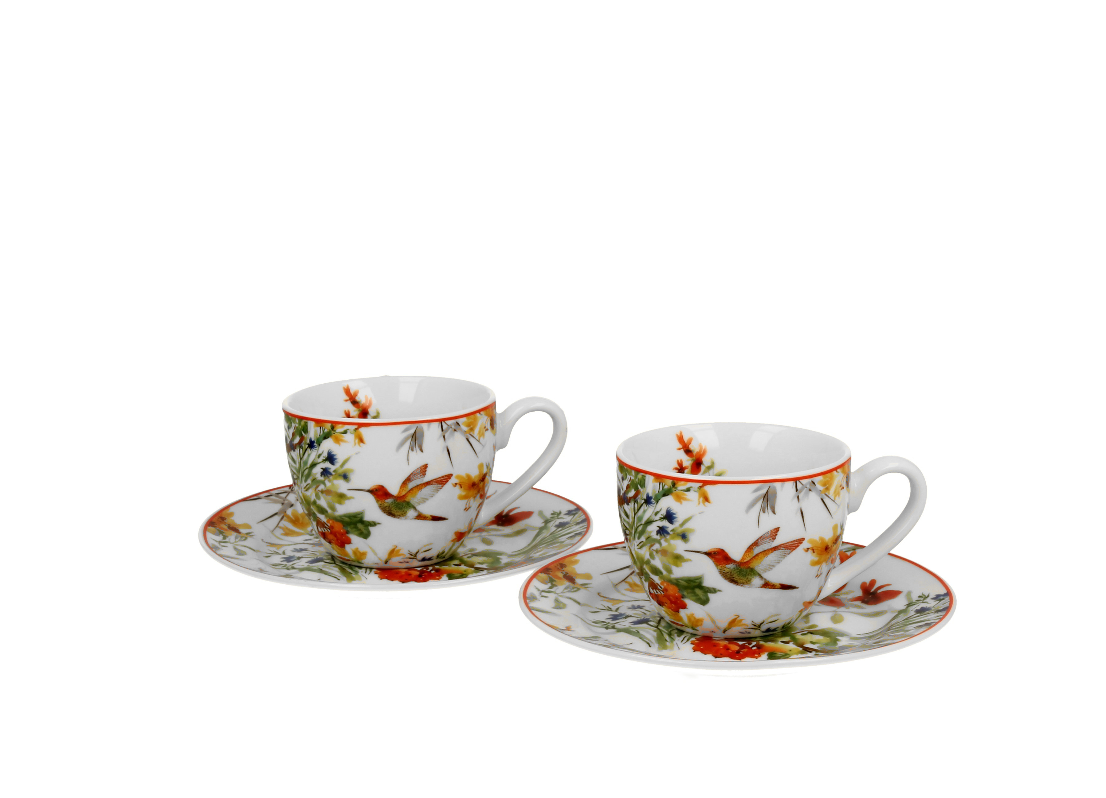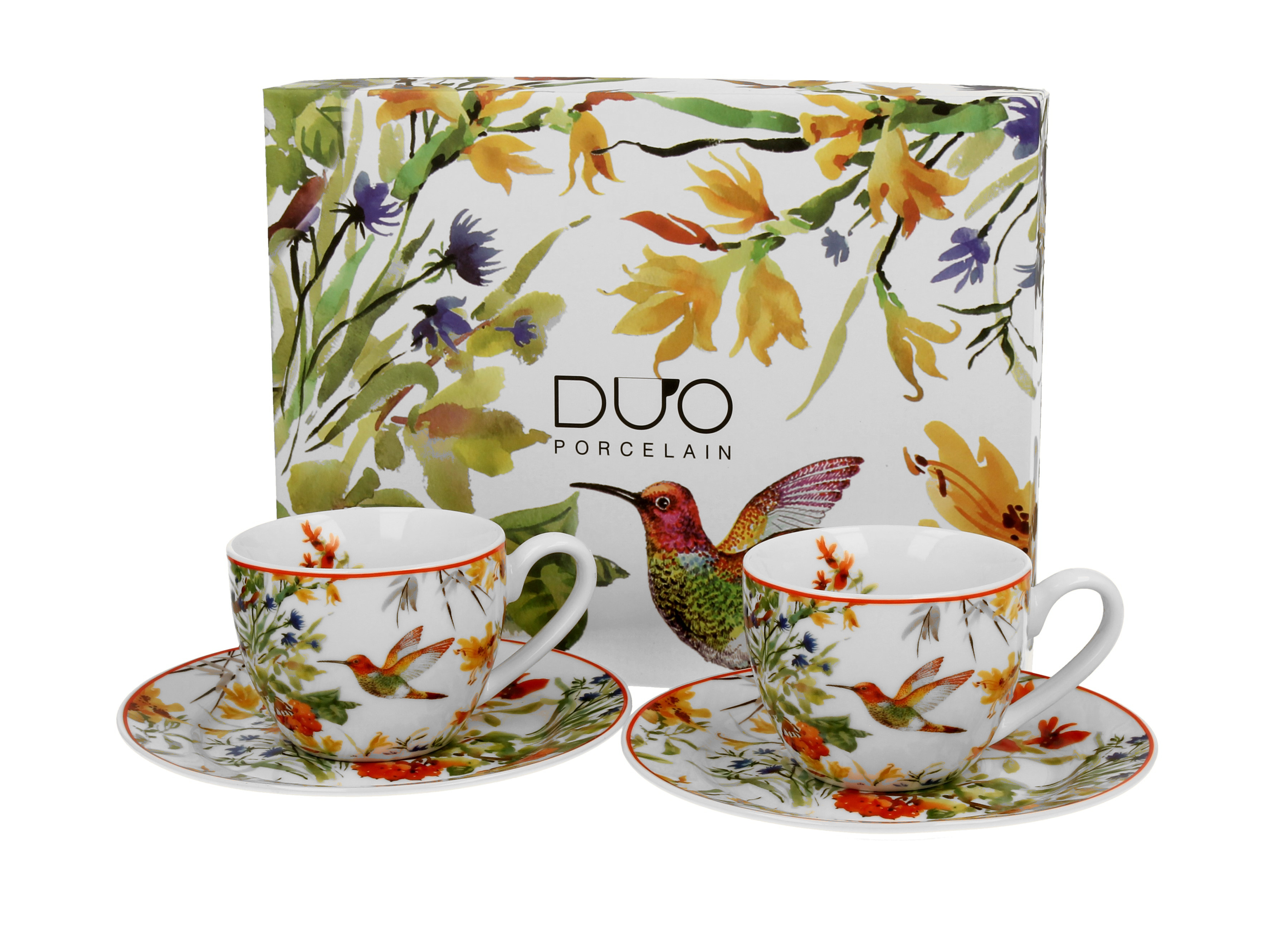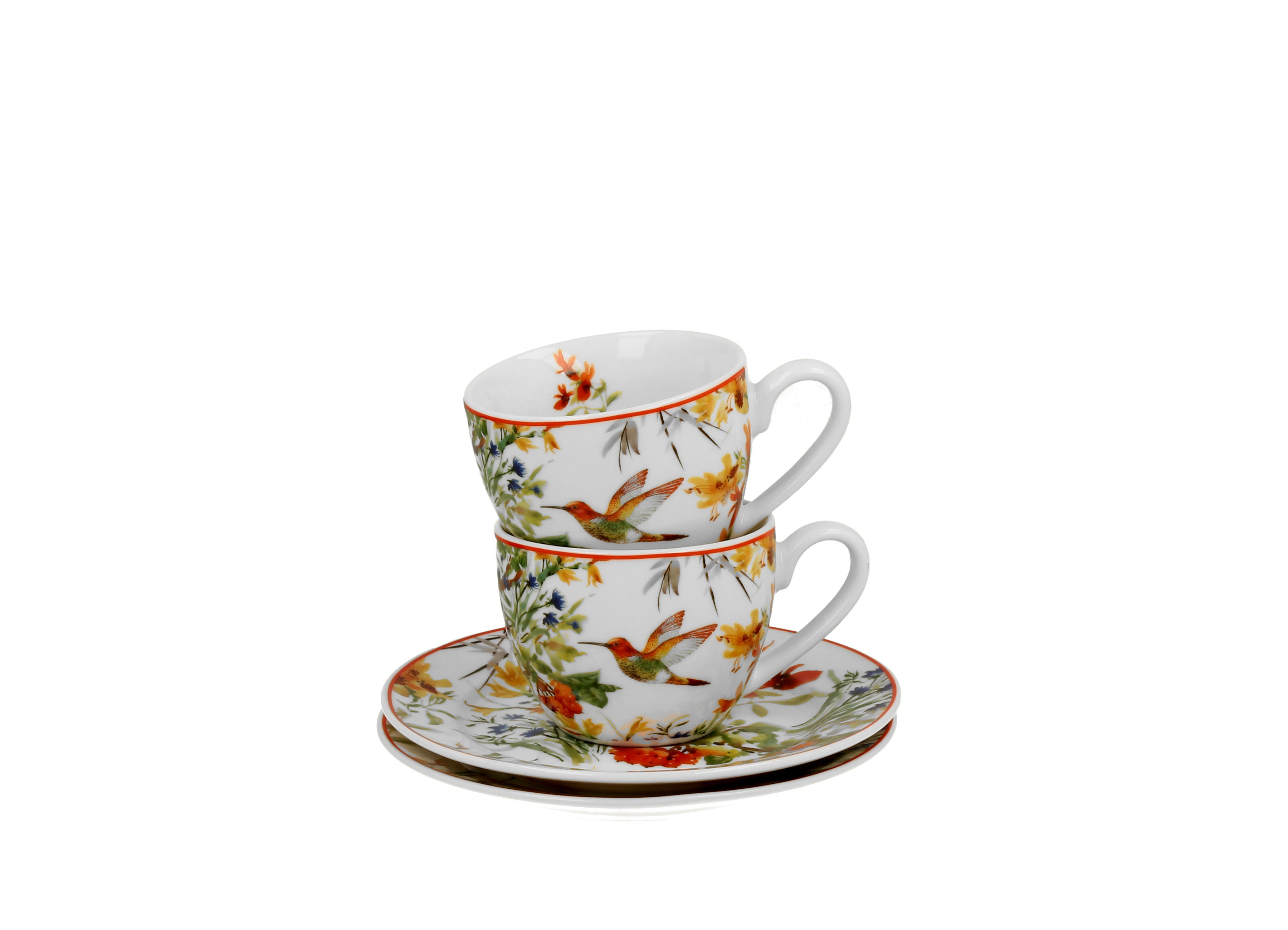 Zestaw dwóch filiżanek espresso ze spodkiem LINNEA, będący częścią serii Flower Classic, został wykonany z wysokiej jakości porcelany New Bone China, która wyróżnia się naturalną kremowo-białą barwą z delikatnym połyskiem oraz wyjątkową wytrzymałością. Linia LINNEA zachwyca malowanymi kwiatami w intensywnych kolorach oraz uroczym kolibrem, tworząc wyjątkowy, świeży akcent w każdej kuchni lub jadalni.