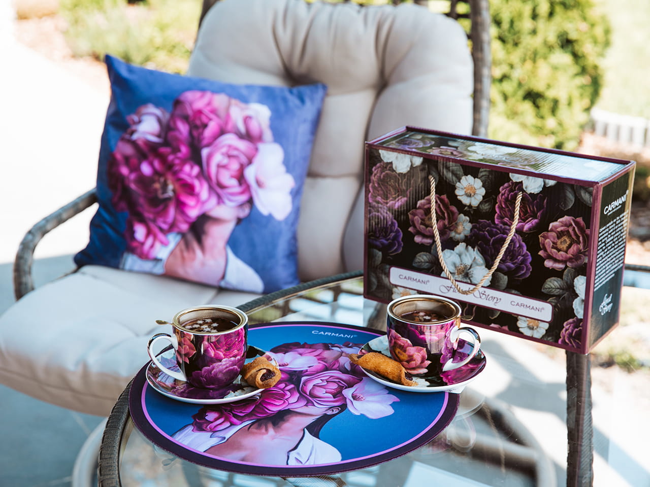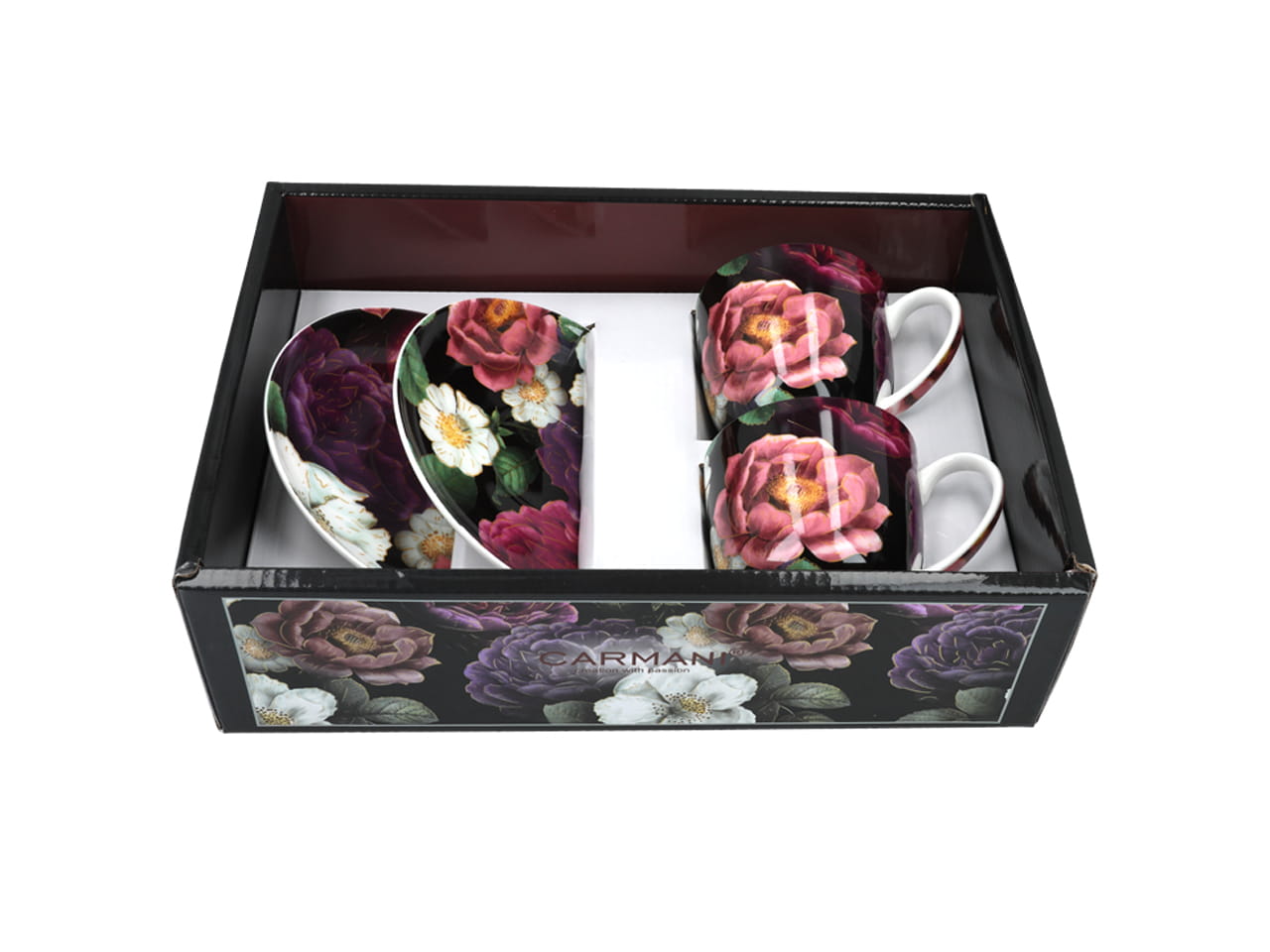Przedstawiamy wyjątkowy zestaw dwóch filiżanek ze spodkami z kolekcji Floral Story od Carmani, który zachwyca elegancją i wyrafinowanym stylem. Każda filiżanka i spodek zdobione są efektowną kompozycją kwiatową na głębokim, czarnym tle, tworząc harmonijną całość, która przyciąga wzrok i podkreśla piękno codziennych chwil. Wykonane z wysokiej jakości porcelany, gwarantują trwałość i komfort użytkowania podczas delektowania się kawą lub herbatą.