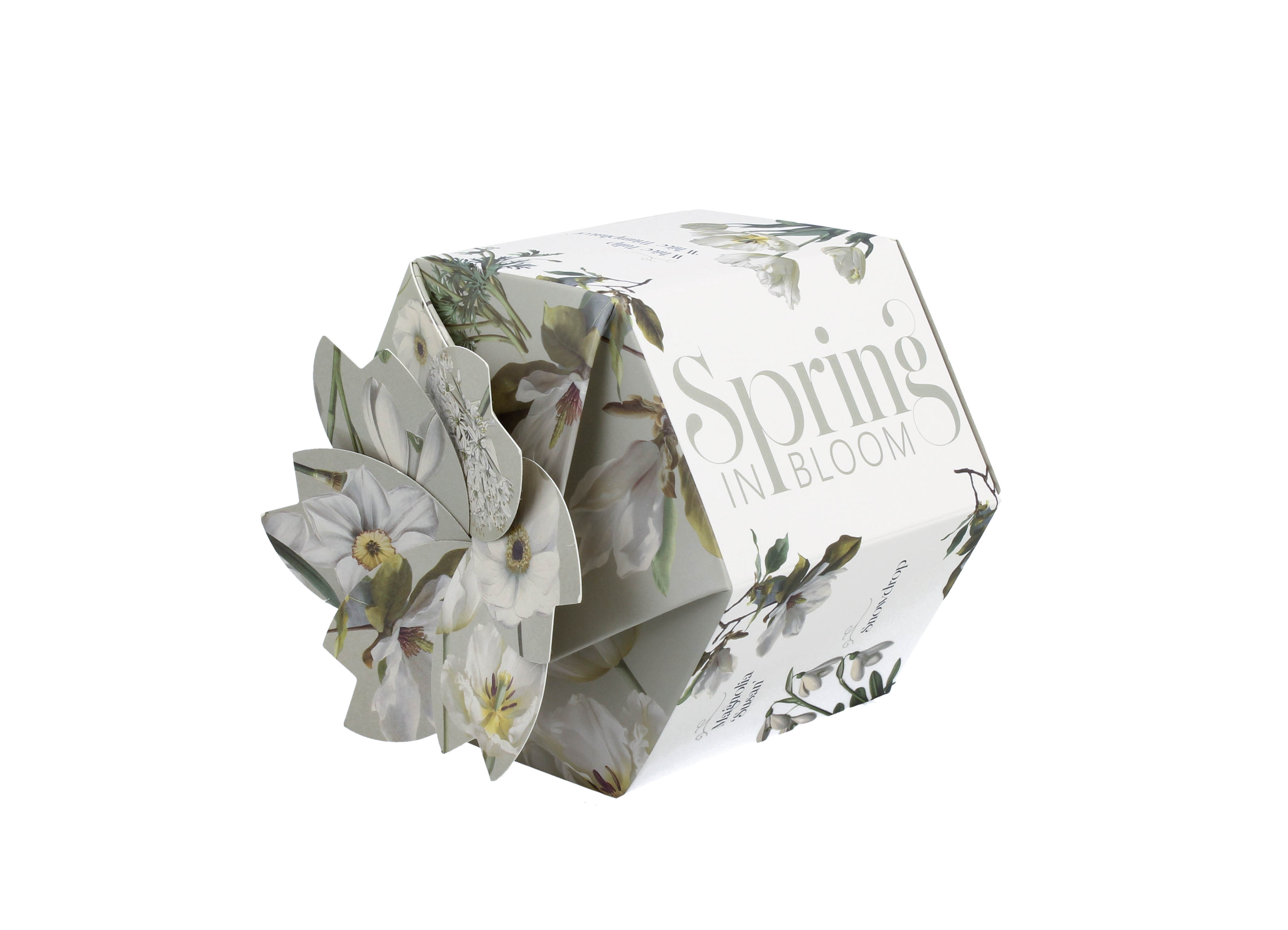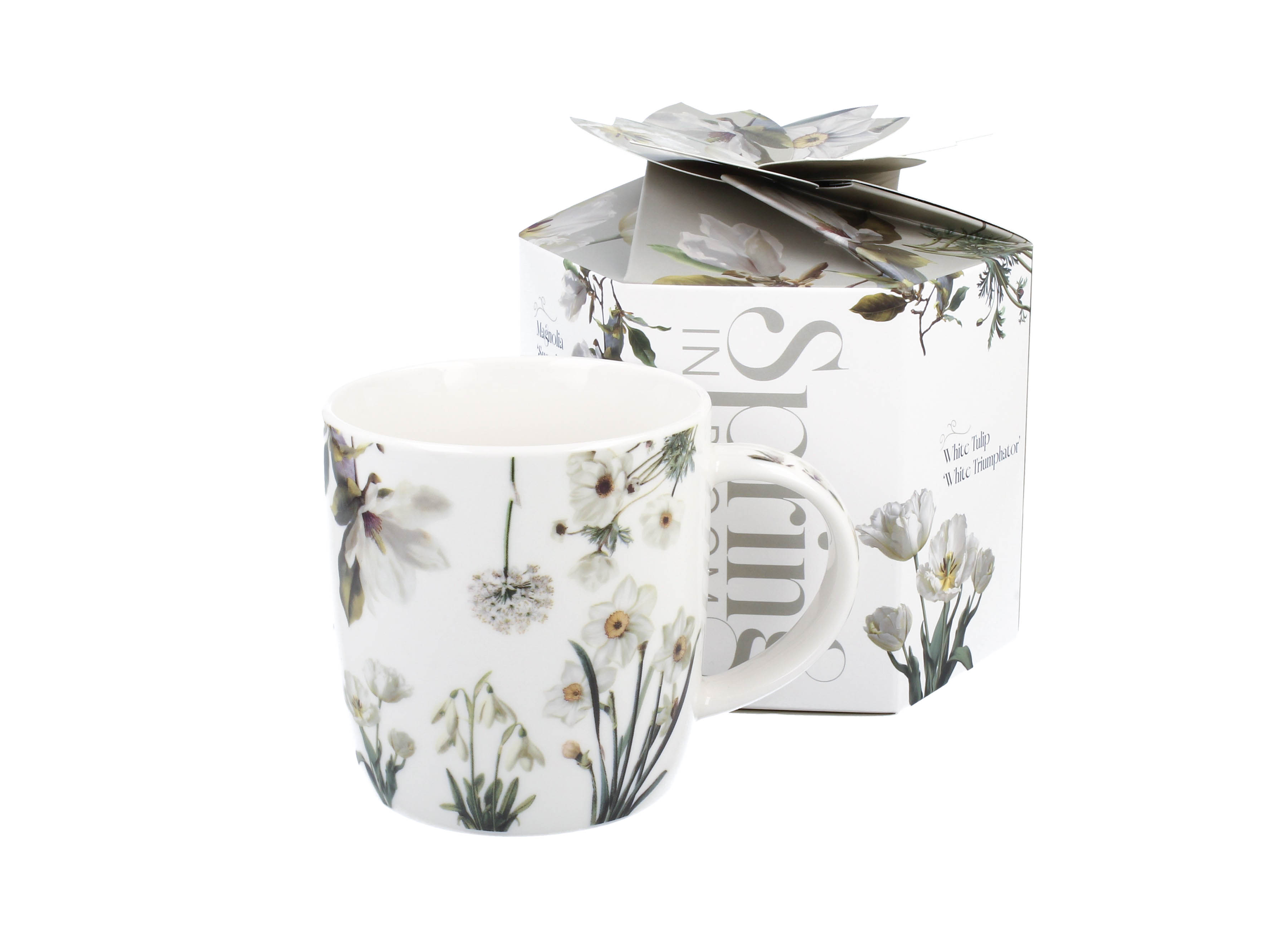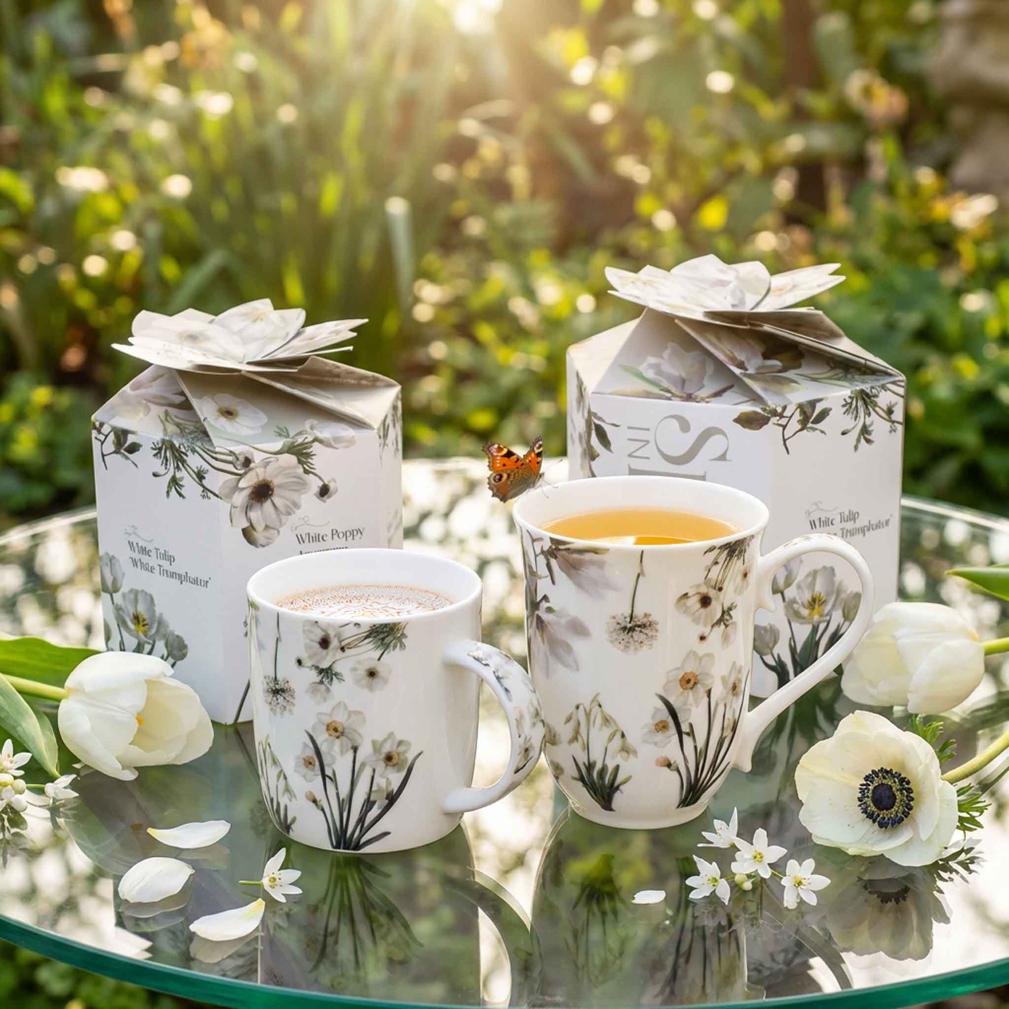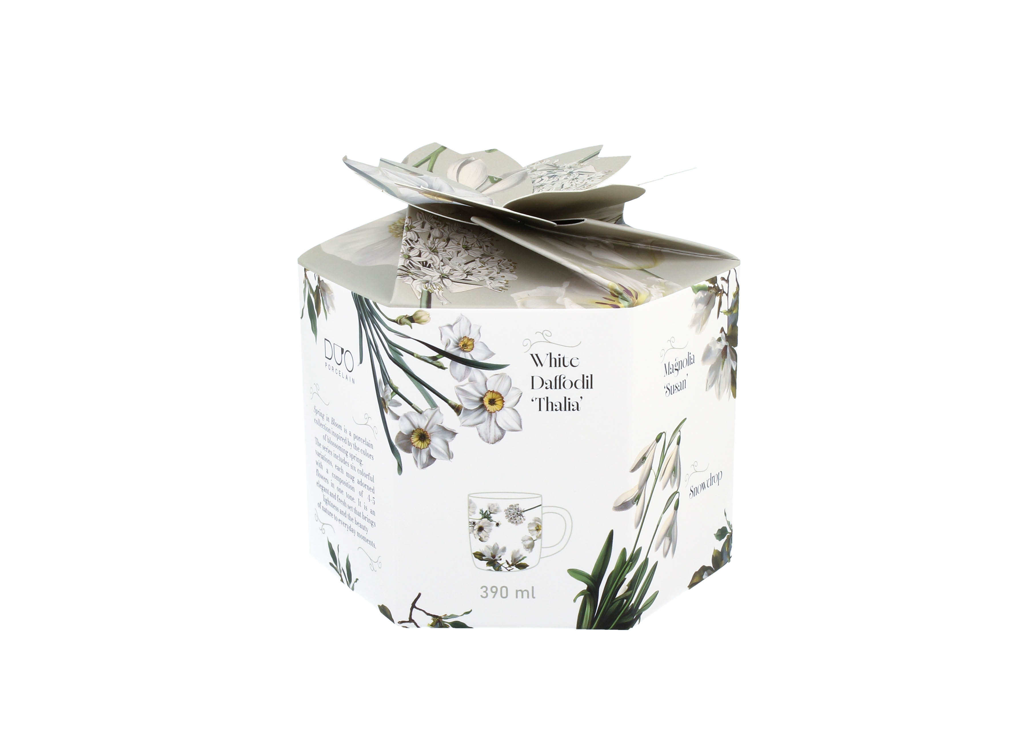 Kubek zapakowany w wyjątkowe, dekoracyjne pudełko, którego otwieranie przypomina rozkwitający kwiat – płatki rozchylają się, odsłaniając zawartość w efektowny sposób, czyniąc go idealnym prezentem.