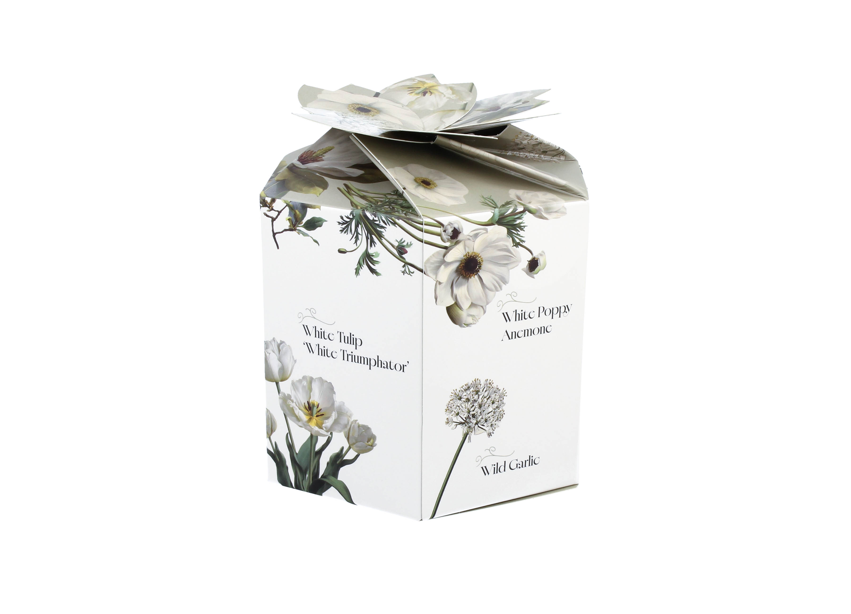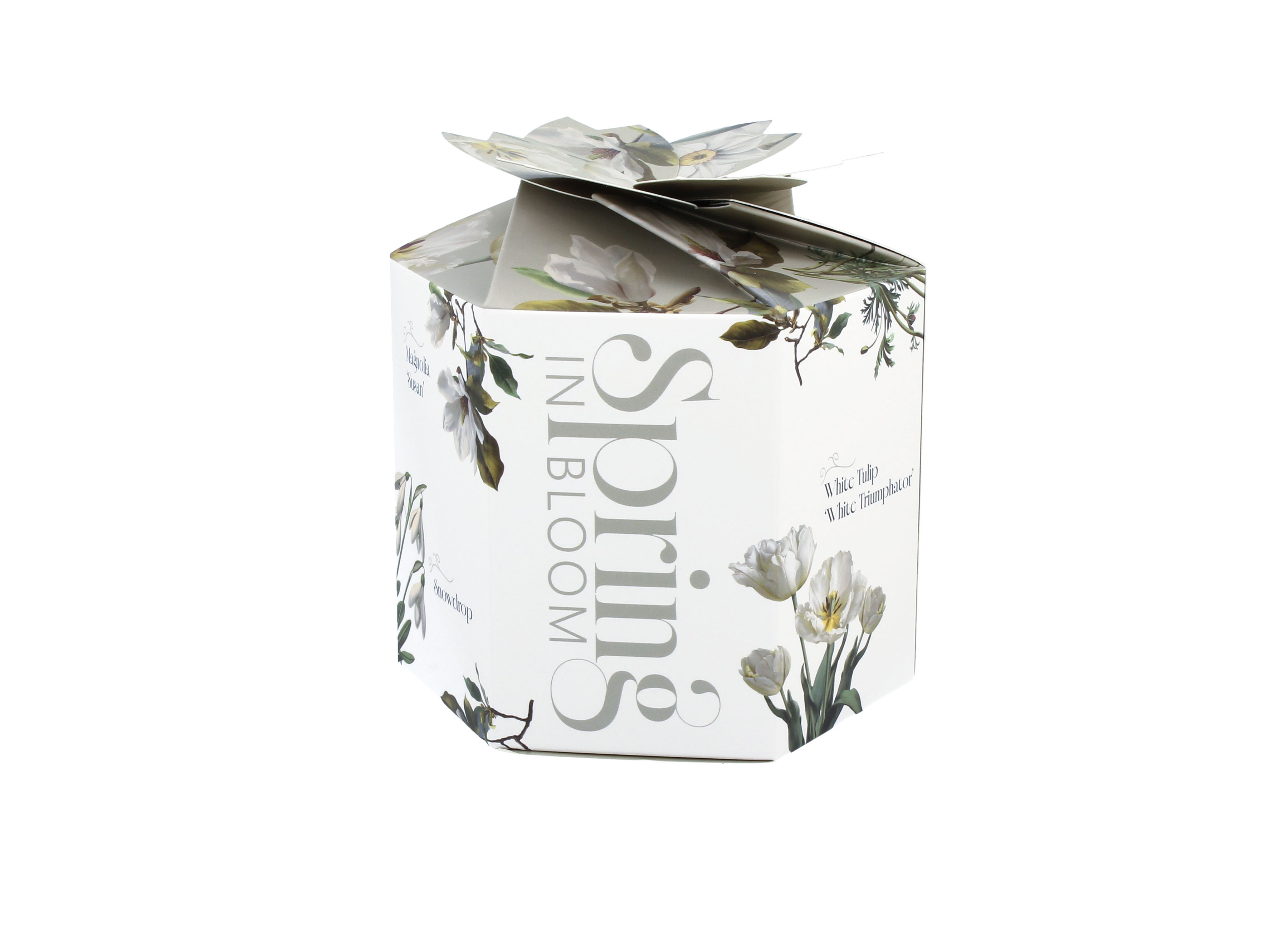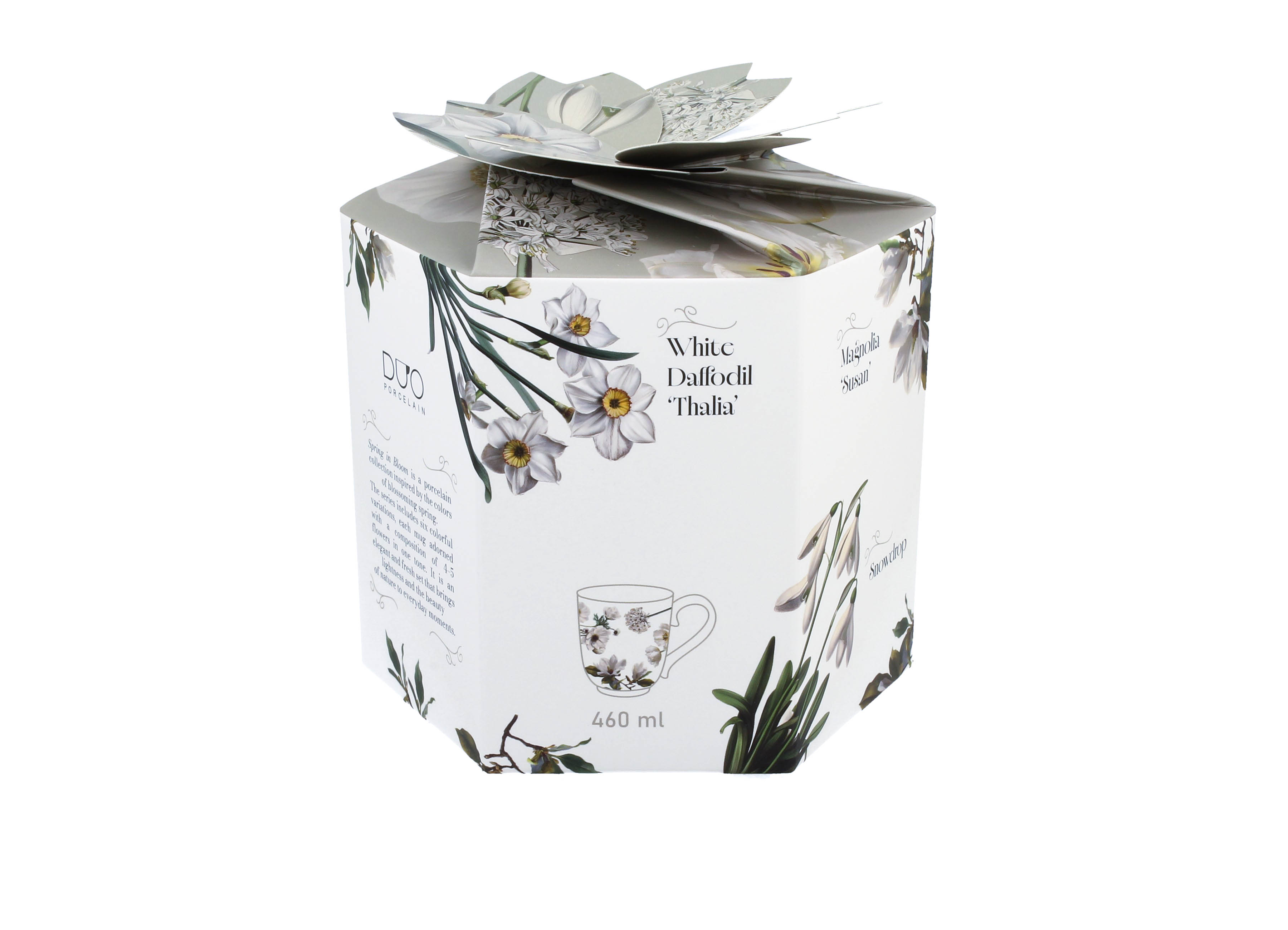 Kubek zapakowany w wyjątkowe, dekoracyjne pudełko, którego otwieranie przypomina rozkwitający kwiat – płatki rozchylają się, odsłaniając zawartość w efektowny sposób, czyniąc go idealnym prezentem.