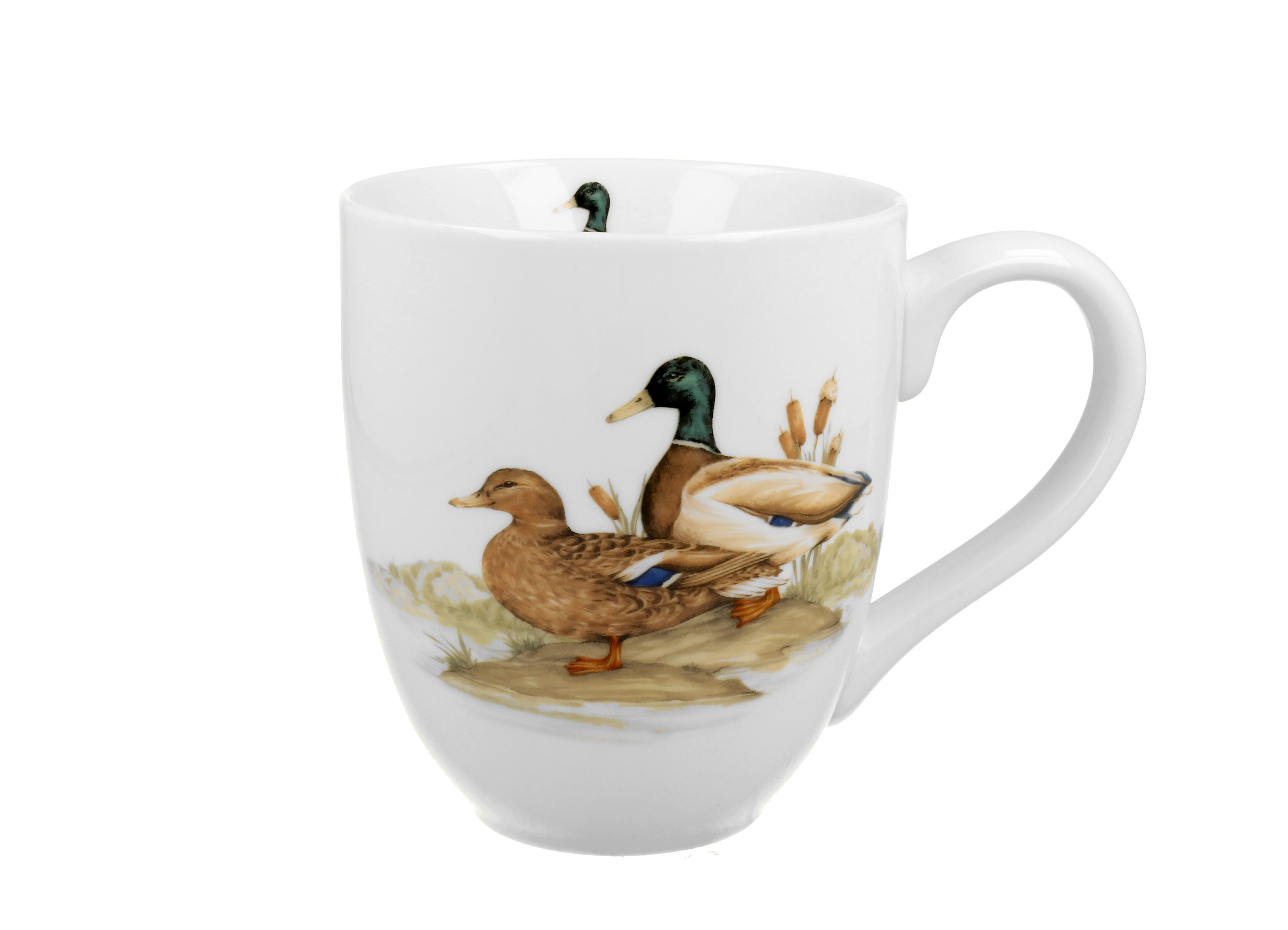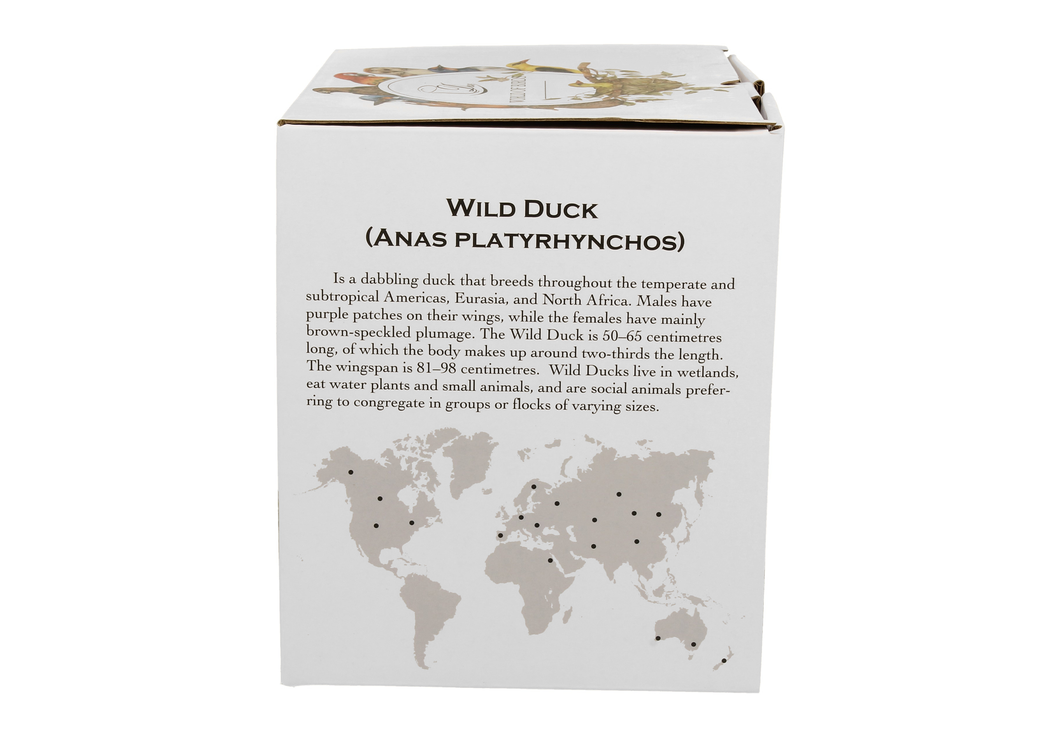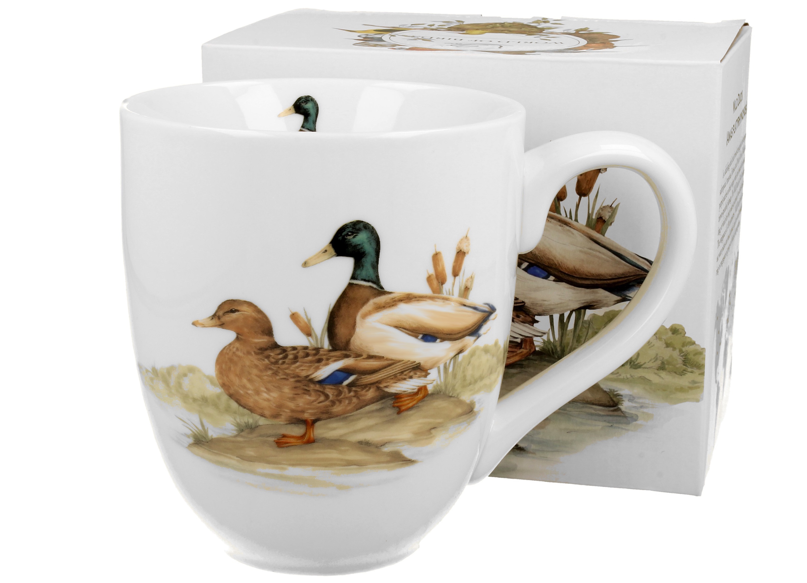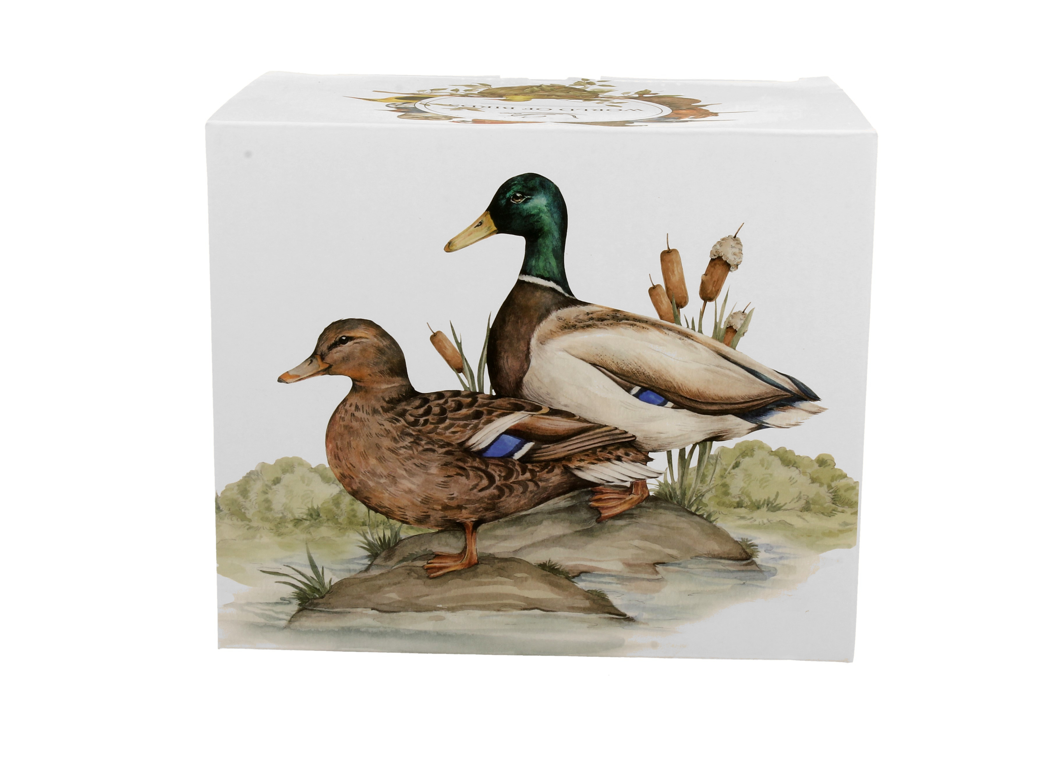 Kubek zapakowany jest w ozdobne pudełko z tym samym motywem kaczki – idealny na prezent dla miłośników przyrody i estetyki.