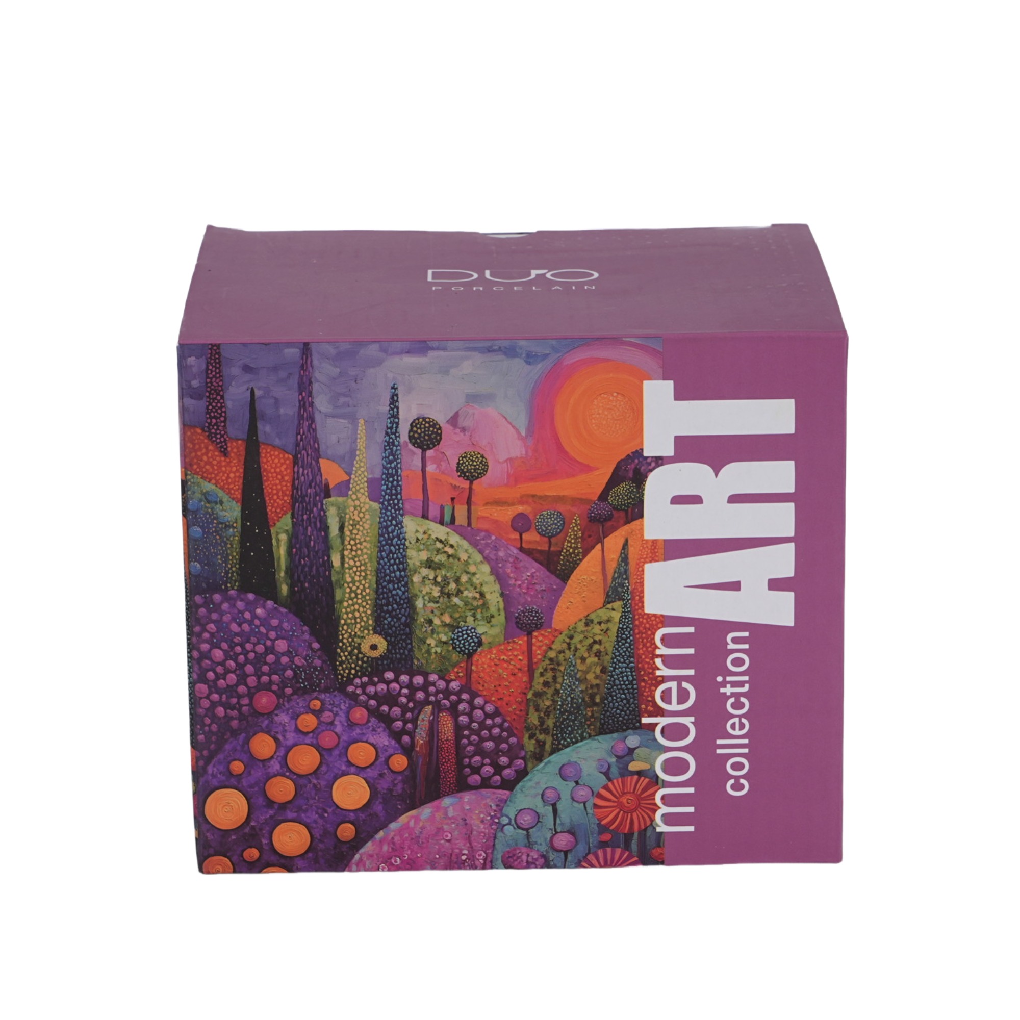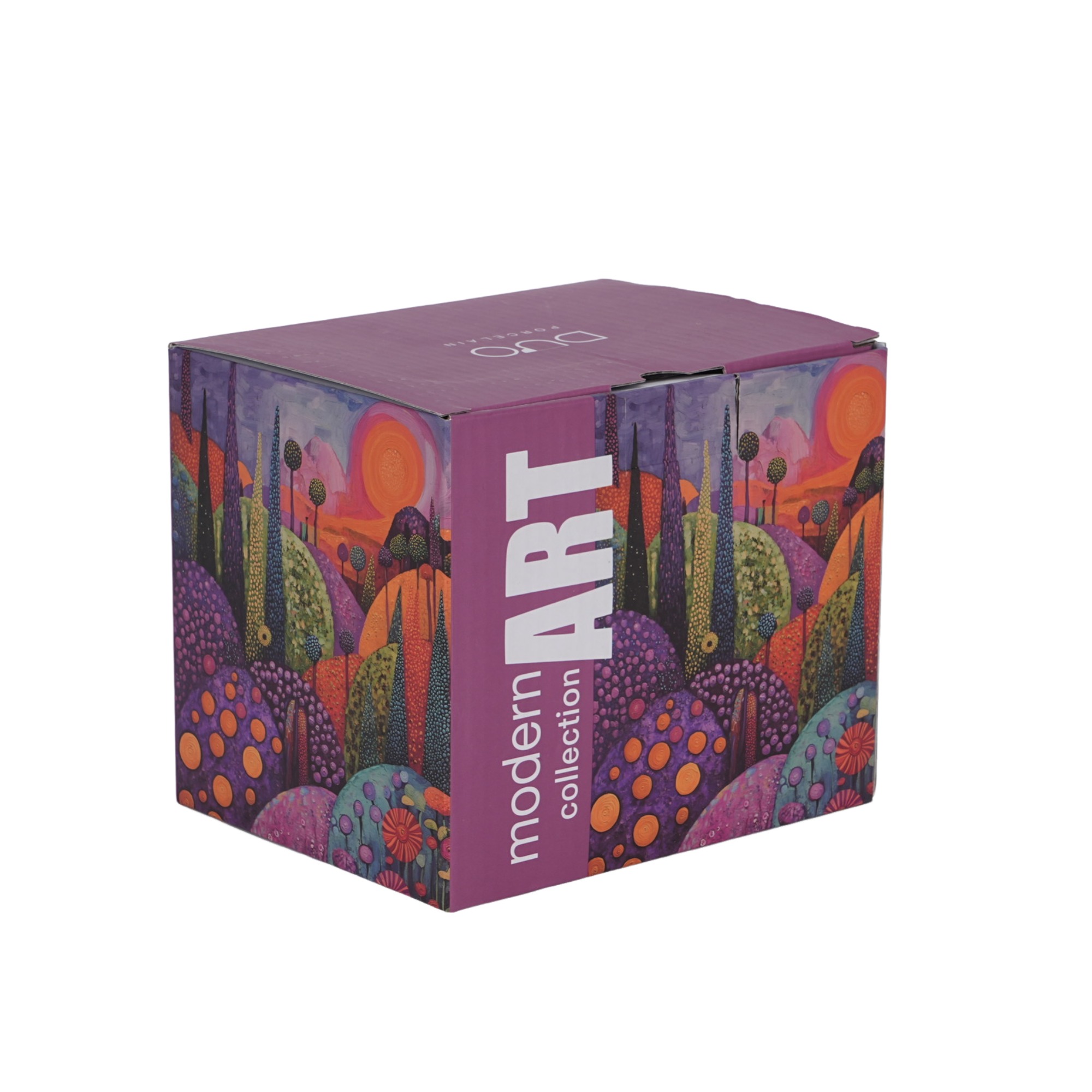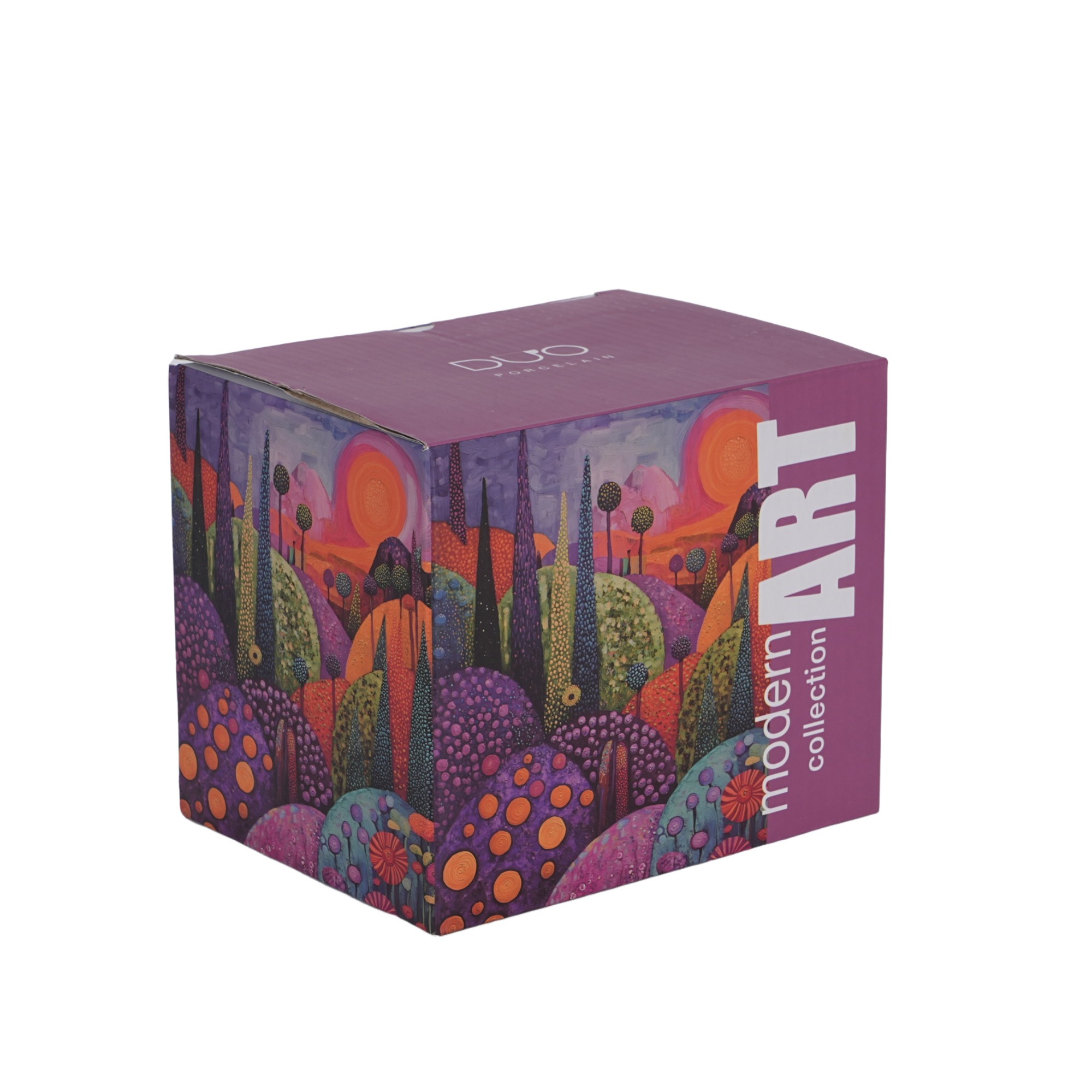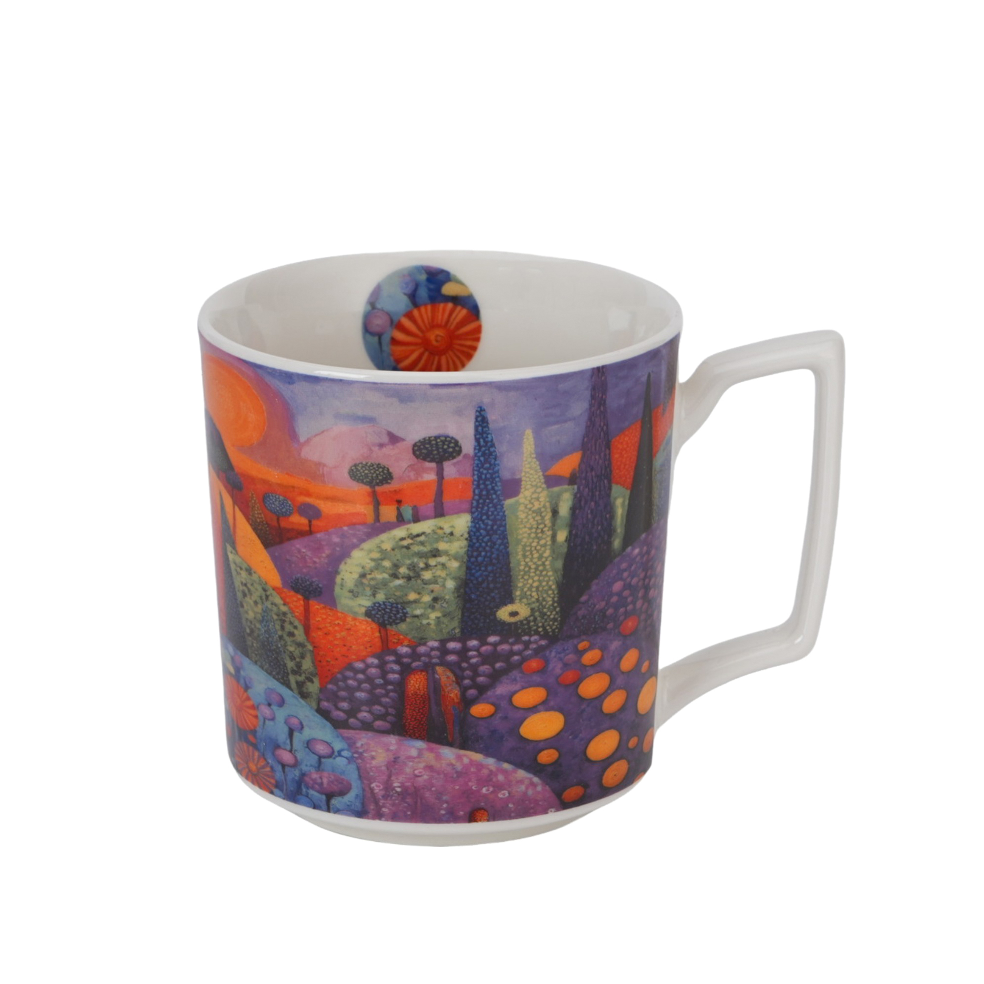 Kubek zdobiony jest nowoczesnym, artystycznym wzorem malowniczego pejzażu falujących wzgórz, pełnych życia i ekspresji. Intensywna paleta kolorów — od głębokich fioletów i różów w tle, przez intensywne pomarańcze i żółcie, aż po soczystą zieleń i spokojny błękit w pierwszym planie — tworzy harmonijną, świeżą kompozycję. Wzór łączy tradycyjne rzemiosło ze współczesnym designem o niezwykle oryginalnym charakterze.
