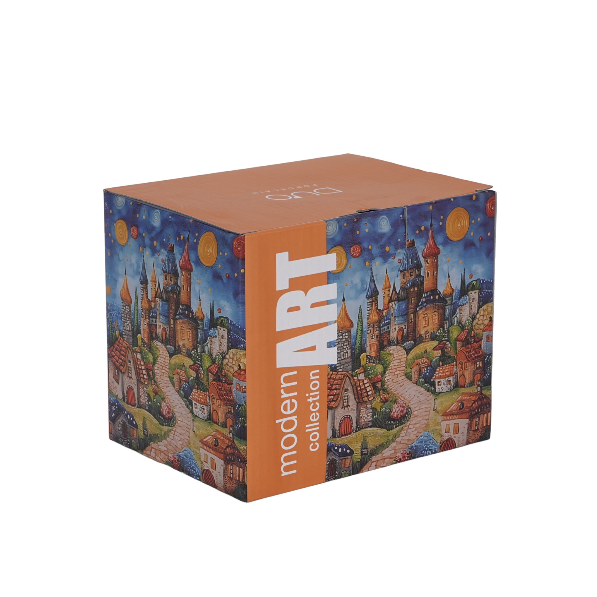 Kubek zdobi malowany wzór przedstawiający bajkowy krajobraz z zamkiem i wieżyczkami na tle uroczej wioski małych domków pod gwiaździstym niebem. Bogata paleta kolorów oraz fantazyjny design tworzą niezwykle harmonijną i magiczną kompozycję, wprowadzając odrobinę baśni do każdej chwili. ❇️ Pałacowy klimat pobudza wyobraźnię i sprawia, że każda przerwa na kawę czy herbatę jest wyjątkowa!