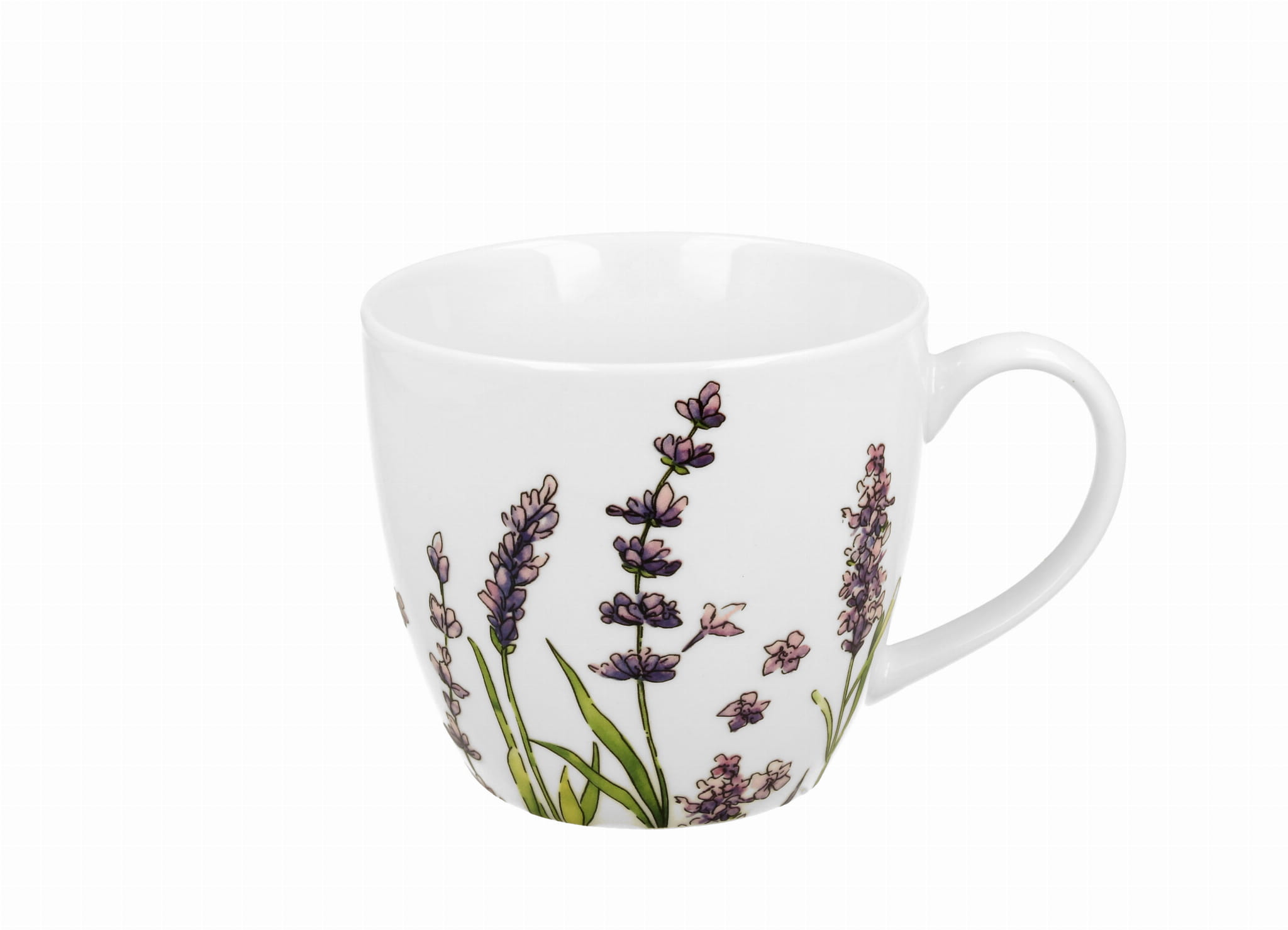 Piękny design: Kubek zdobiony jest motywem malowanych gałązek lawendy w intensywnie fioletowym kolorze, który "wyrasta" z podstawy kubka. Motyw ten jest wykonany z dbałością o szczegóły i nadaje kubkowi elegancki i romantyczny charakter.