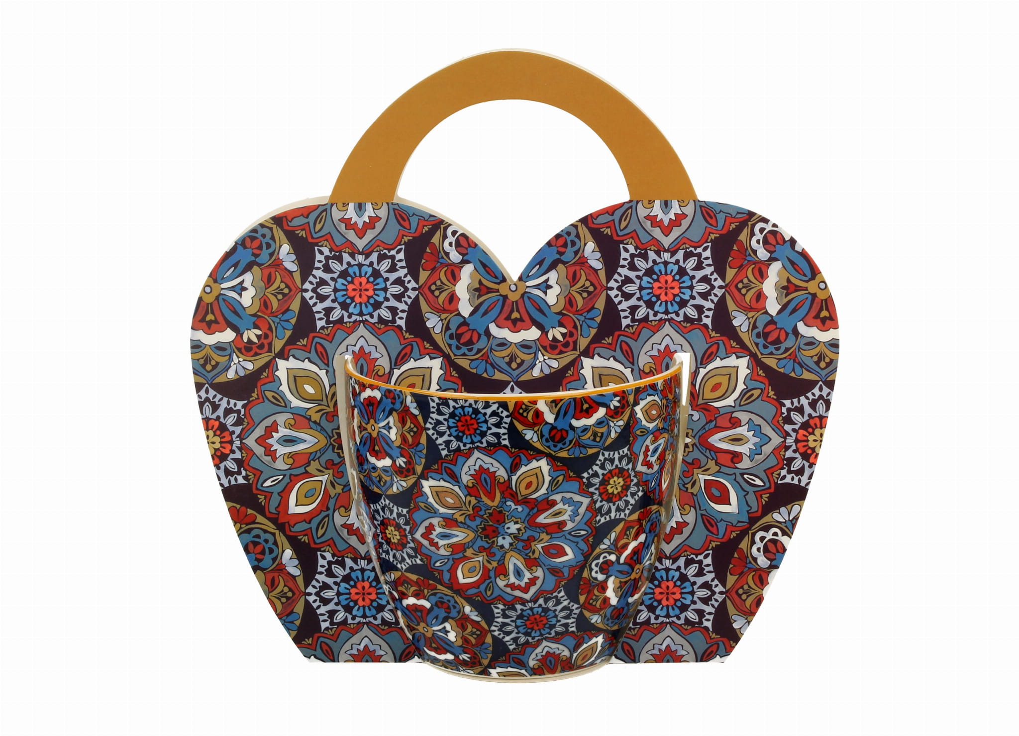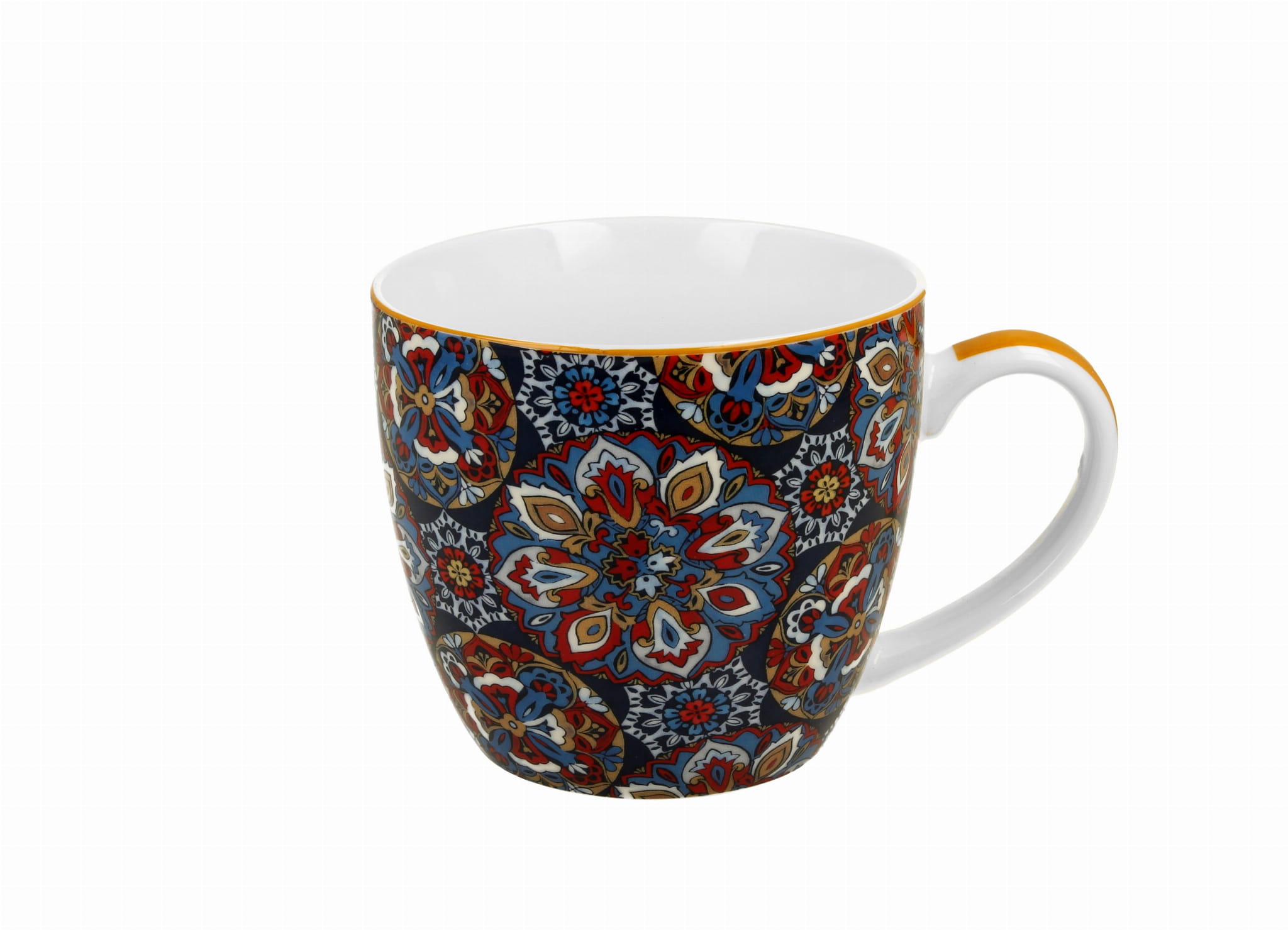 Kubek RANAK BLUE z serii BICO. Wyjątkowy kubek porcelanowy New Bone China, zdobiony etnicznym motywem wzorzystych kół w odcieniach granatu i bordo. Elegancki design i trwałość porcelany sprawiają, że kubek jest zarówno praktyczny, jak i stanowi piękną ozdobę każdej kuchni. Idealny prezent dla miłośników unikalnych wzorów i wysokiej jakości.