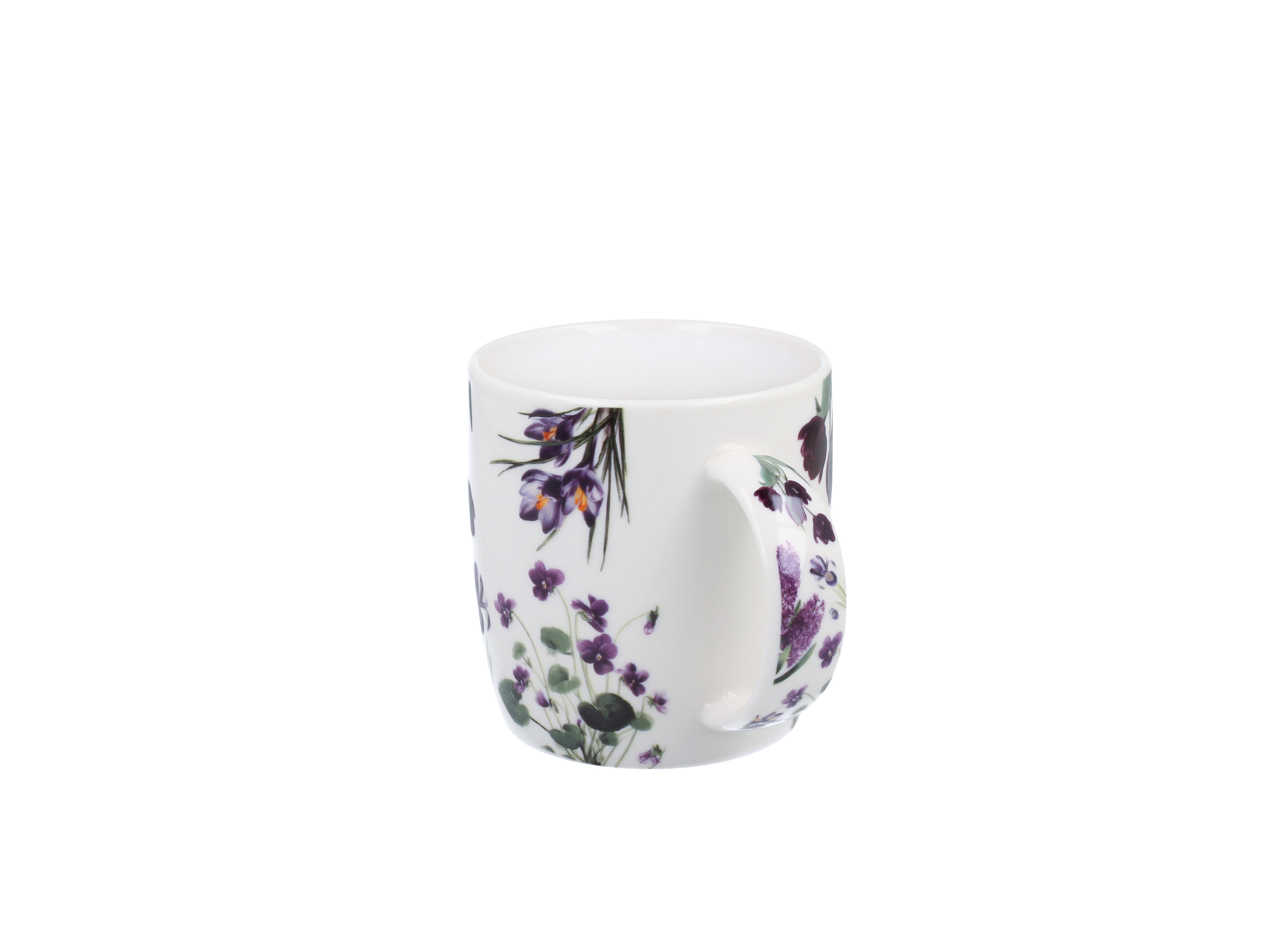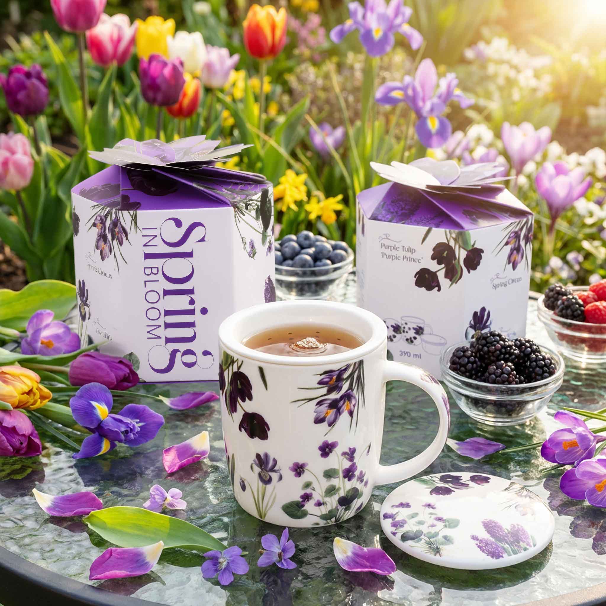Kubek z zaparzaczem „Fioletowe kwiaty” z serii „Wiosna w rozkwicie” to elegancki zestaw porcelanowy New Bone China o naturalnym kremowo-białym kolorze z delikatnym połyskiem, wyjątkowej wytrzymałości i trwałości, zachowując lekkość i finezję.