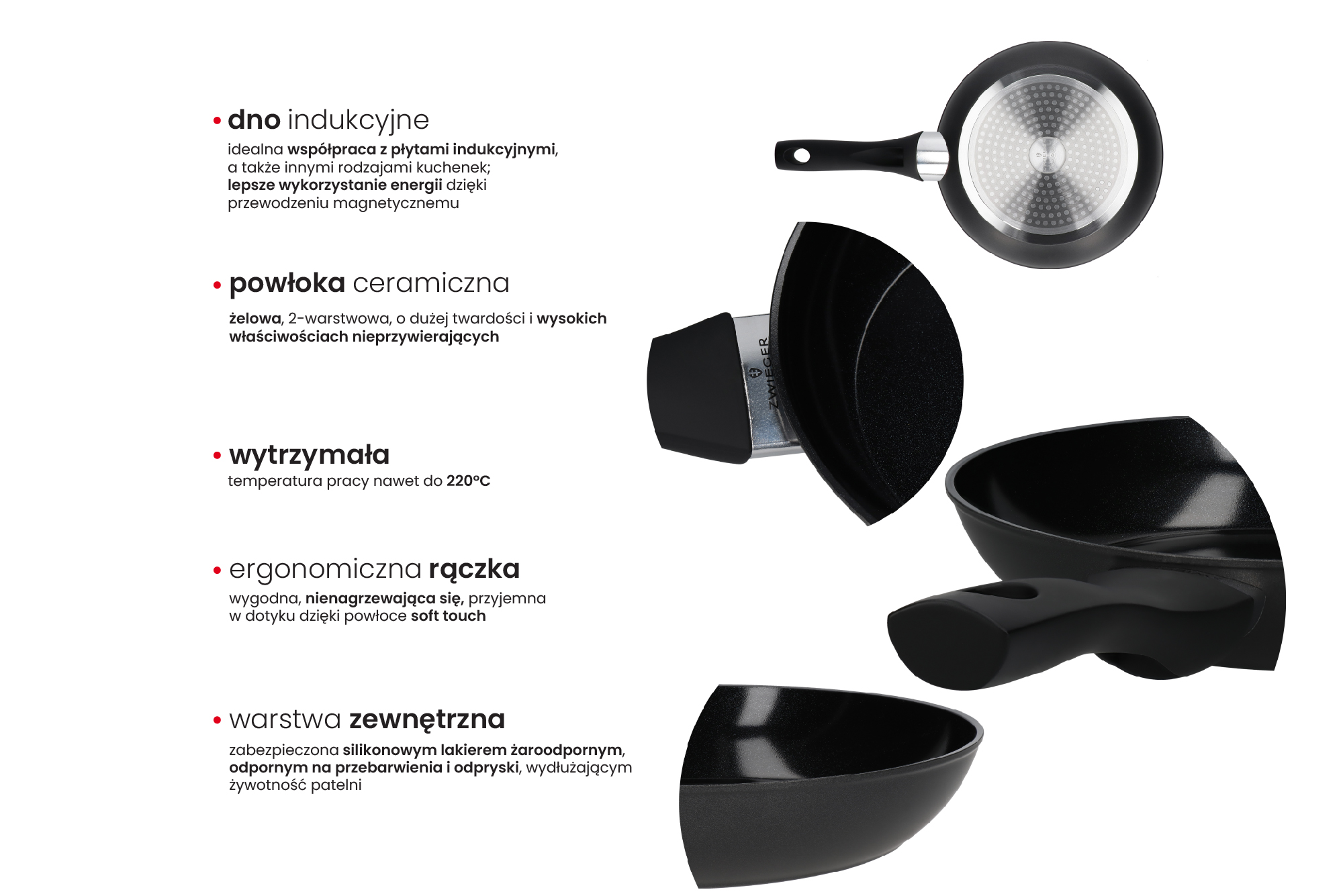 ✔️ Rączka: z nieprzewodzącego ciepła materiału PP z powłoką soft touch – ergonomicza, pewny i przyjemny chwyt
