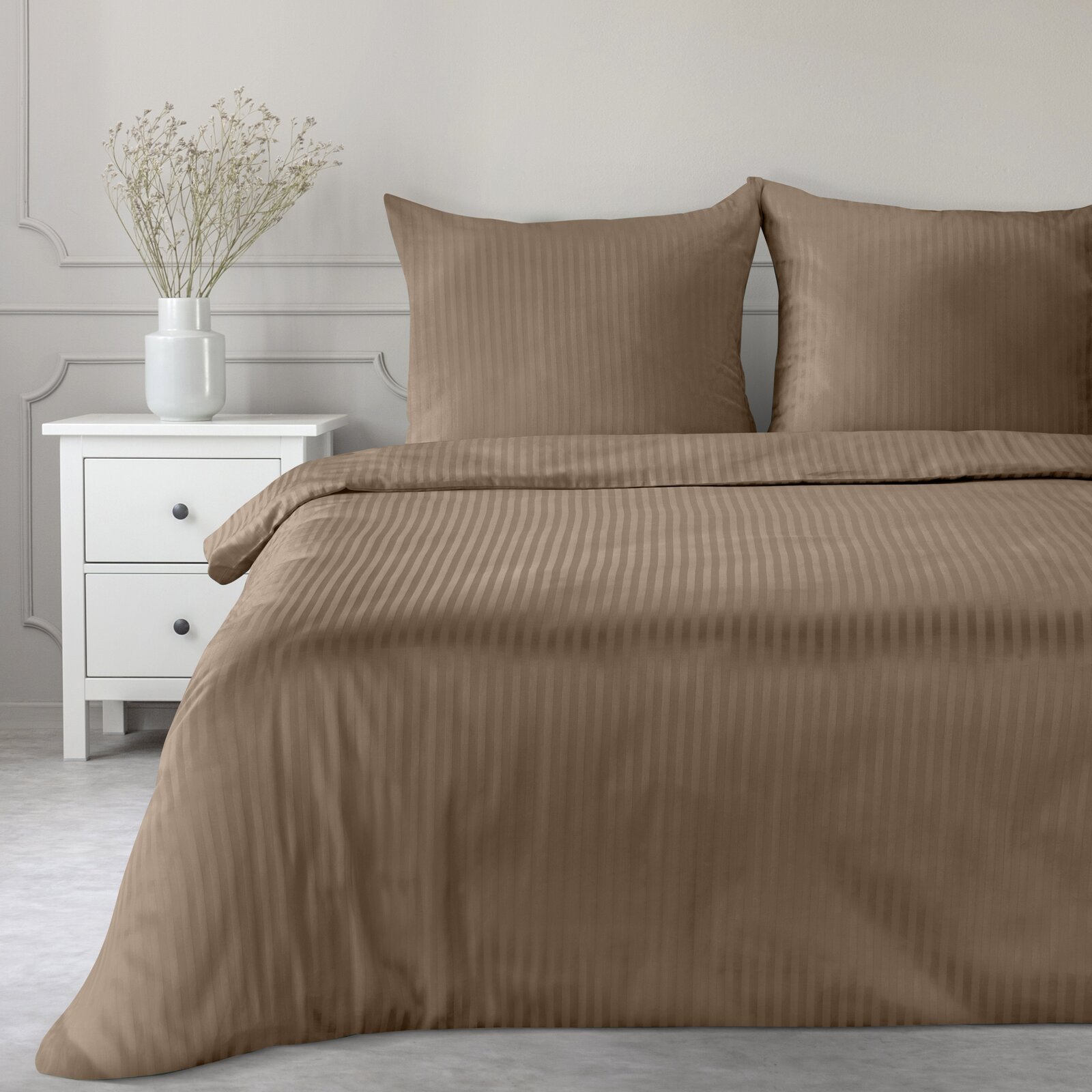 Luksusowy wygląd – satynowy połysk i finezyjne prążki sprawiają, że Twoja sypialnia zyska nowy wymiar elegancji.