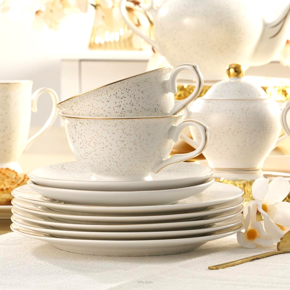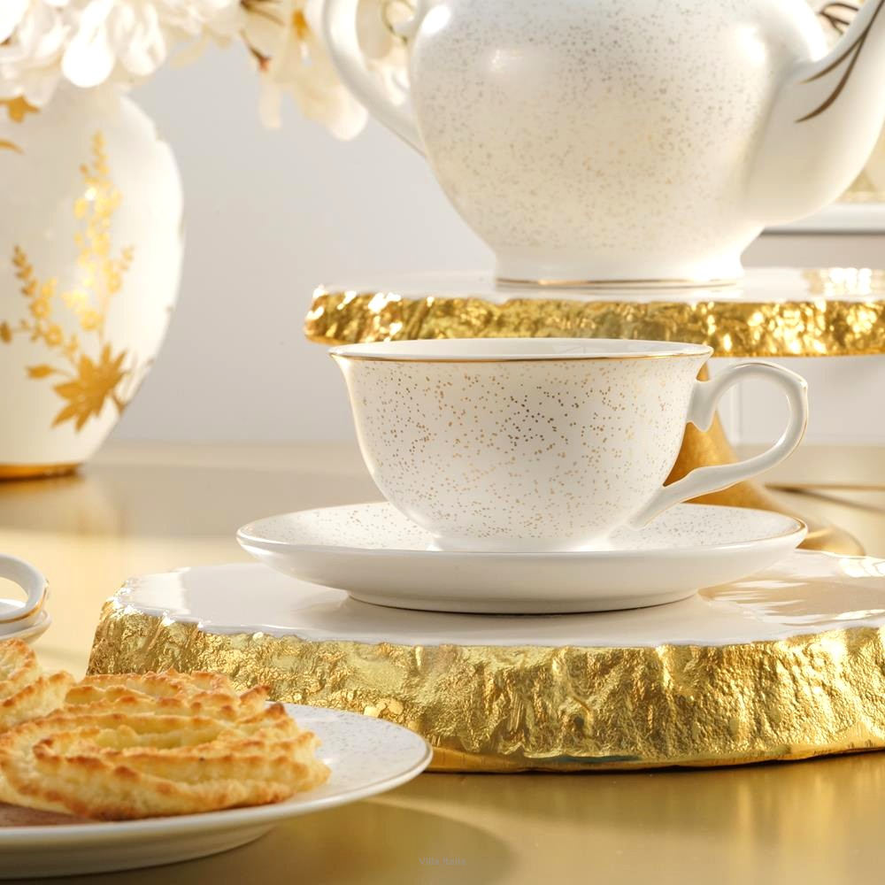 Filiżanka do herbaty SUNSET o pojemności 230 ml to elegancka propozycja z kolekcji Tea & Coffee Collection marki Villa Italia. Wykonana z wysokiej jakości porcelany typu NBC w ciepłym odcieniu bieli, zachwyca klasycznym wzornictwem i subtelną dekoracją w postaci bardzo drobnych, złotych kropek. Obrzeża filiżanki i spodka są ręcznie malowane złotem, a matowe wykończenie podkreśla jej wyjątkowy charakter.