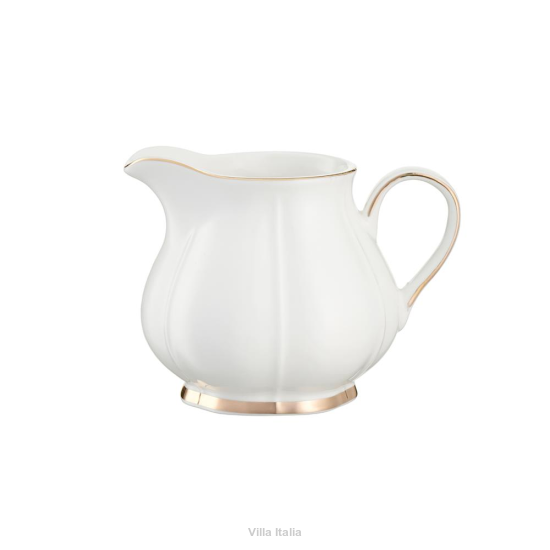 Mlecznik z kolekcji porcelany SANDRINE. Ta pełna uroku linia marki Villa Italia zachwyca opływowymi, wyprofilowanymi kształtami, które decydują o jej klasycznym charakterze. Elegancji dodają naczyniom ręcznie wykonane, złote zdobienia.
