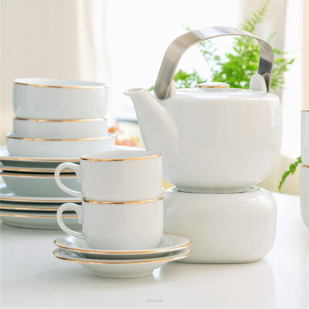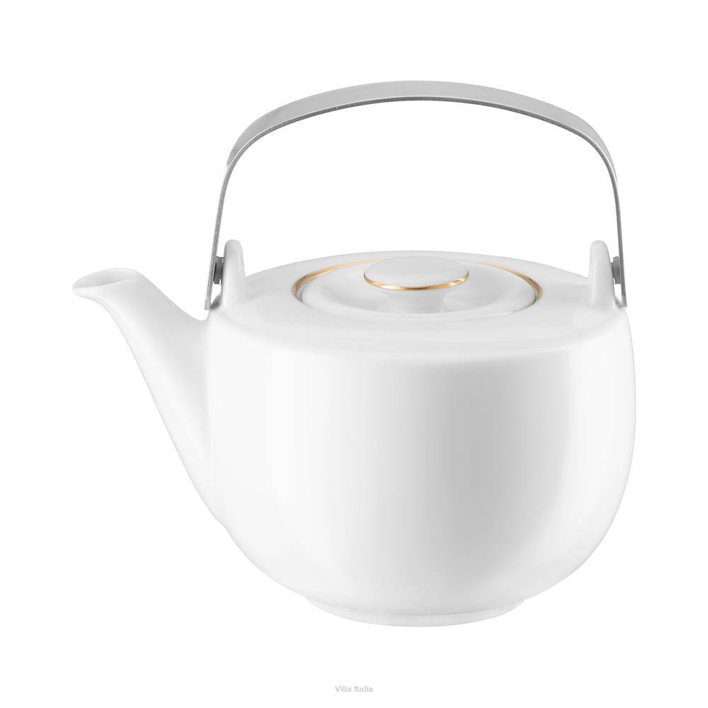 Uroczy czajnik do herbaty o kulistym kształcie z kolekcji PLUS Gold - wykonanej z najwyższej jakości porcelany w pięknym, śnieżnym odcieniu bieli. Elementy kolekcji zostały ręcznie uformowane. Linia PLUS ma zdecydowanie nowoczesny charakter. Wiele elementów ma podwójne zastosowanie. Naczynia posiadają cienkie, delikatne zdobienia w postaci ręcznie malowanych, złotych linii. Pojemny dzbanek wyposażony jest w modny, stalowy uchwyt i ozdobiony złotymi obwódkami na obrzeżu i przykrywce. W komplecie do dzbanka PLUS Gold dostępny jest w naszym sklepie porcelanowy podgrzewacz na tealight.
