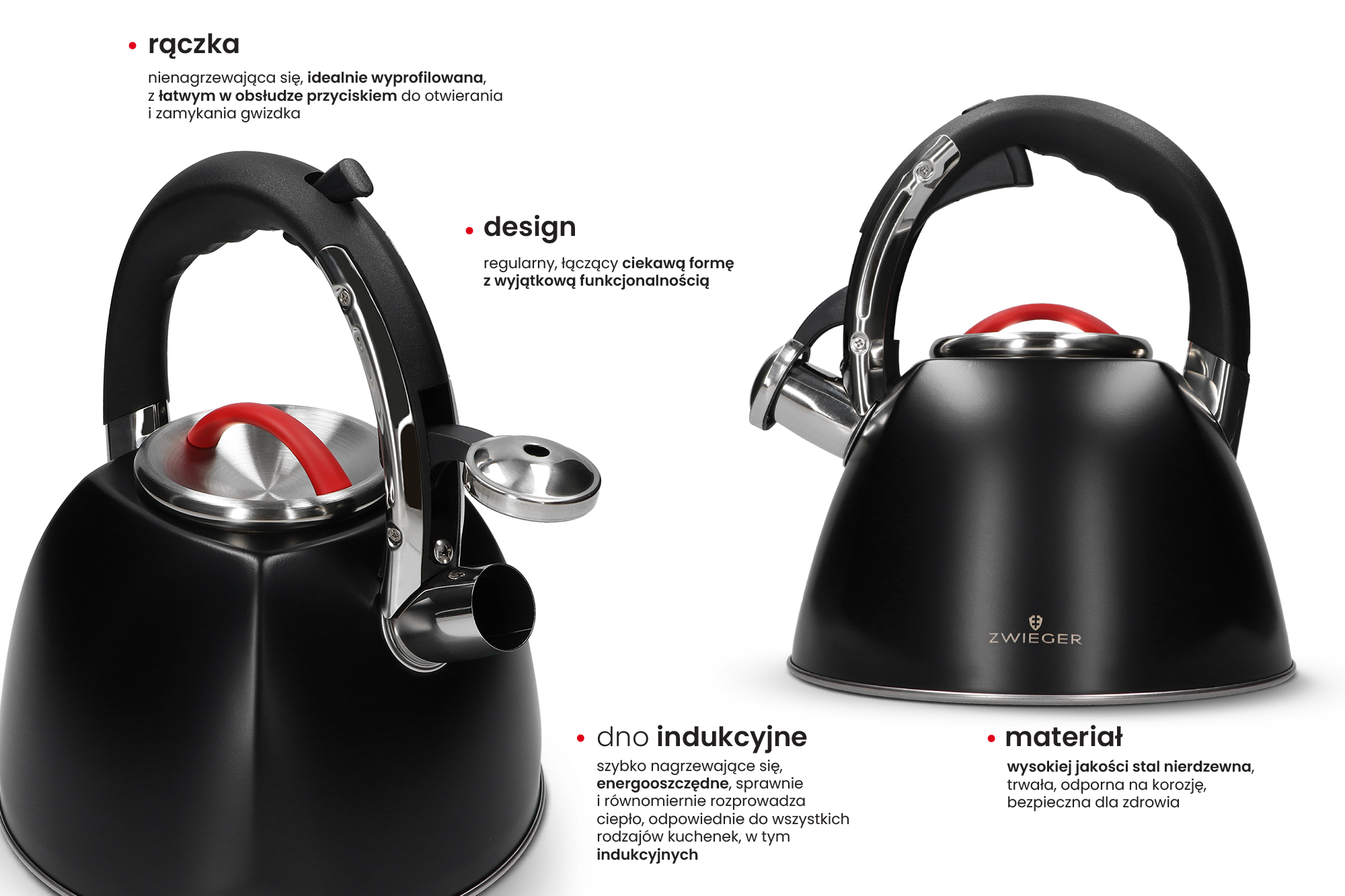 Specjalnie wyprofilowana rączka z przyciskiem do otwierania i zamykania gwizdka ułatwia intuicyjną obsługę jedną ręką. Dno indukcyjne zapewnia szybkie i równomierne nagrzewanie wody na wszystkich rodzajach kuchenek, w tym indukcyjnych, co czyni czajnik energooszczędnym i wszechstronnym. Regularny, nowoczesny design łączy estetykę z funkcjonalnością, stanowiąc stylowy akcent w każdej kuchni.