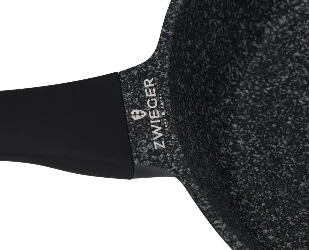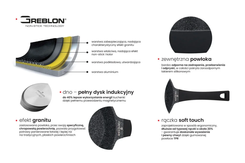 Patelnia Zwieger z odlewanego aluminium. Nowoczesna, trzywarstwowa powłoka granitowa GREBLON C3 GRANITE pokrywa wewnętrzną część naczynia. Dzięki nowatorskiej technologii, pozwalającej zredukować ilość powłok do trzech warstw, patelnia doskonale przewodzi i akumuluje ciepło. Ze względu na swoje wyjątkowe właściwości, zwiększające odporność na zarysowania, powłoka GERBLON C3 GRANITE stosowana jest w naczyniach najwyższej klasy. Dodatkowo, żaroodporny lakier silikonowy, który pokrywa patelnię na zewnątrz, sprawia, że zachowuje ona swój estetyczny wygląd na długie lata. Naszych patelni można używać na wszystkich rodzajach kuchenek, w tym na płytach indukcyjnych. Co więcej, użyty pełny dysk indukcyjny, dzięki pełnemu przewodzeniu magnetycznemu, zapewnia lepsze wykorzystanie energii (30 – 50 %). Zastosowana nieprzywierająca powłoka pozwala smażyć przy minimalnym lub całkowitym braku użycia tłuszczu, co niewątpliwie przekłada się na zdrowy tryb życia. Maksymalna temperatura pracy wynosi 240 st.C.