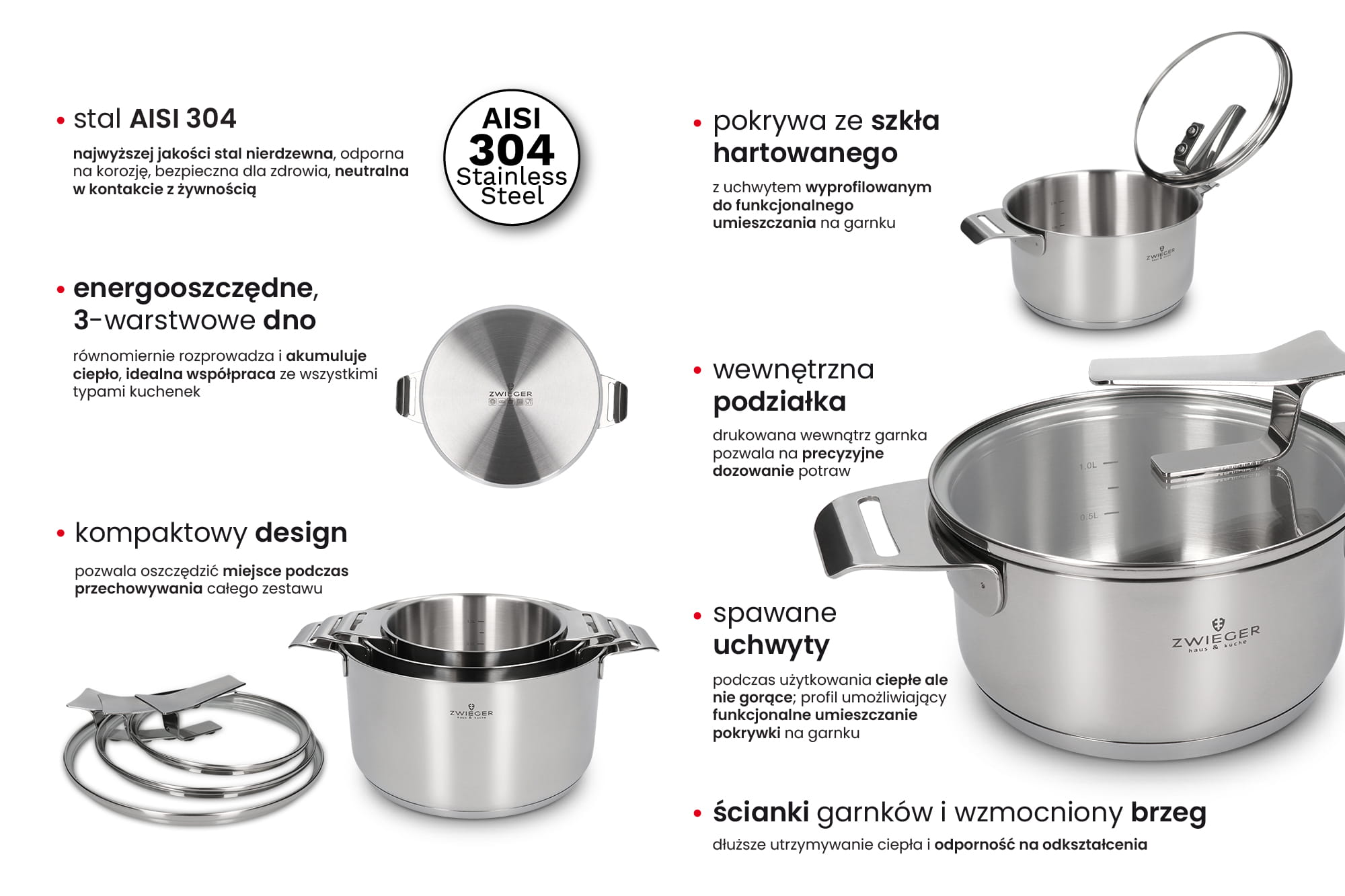 Rozmiary garnków: 16 cm, 20 cm, 24 cm